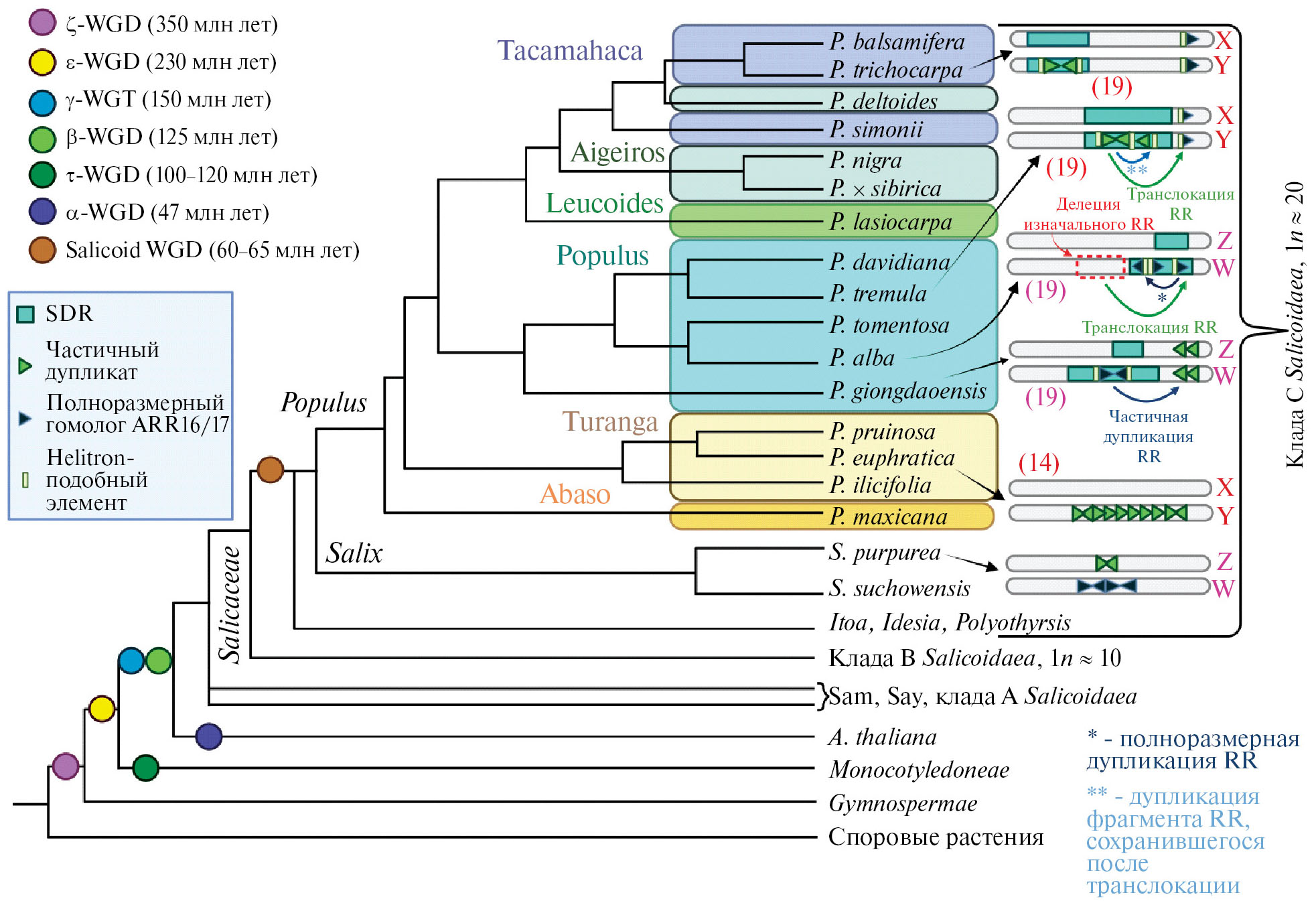 Рис. 1. Филогения и эволюция системы определения пола у Salicaceae. В ходе эволюции растений их геномы подверглись множеству полногеномных дупликаций, включая ζ-WGD, ε-WGD, γ-WGT, τ-WGD, β-WGD, α-WGD и саликоидную WGD. Представители родов Salix и Populus разошлись после саликоидной WGD предковых форм. Род Populus делится на секции Abaso, Turanga, Populus, Leucoides, Aigeiros и Tacamahaca, из которых последние три объединяют в группу ATL. Среди тополей встречаются виды, обладающие как ZW, так и XY системами определения пола. У некоторых тополей, например, у P. tremula, P. deltoides, P. balsamifera внутри SDR находятся дуплицированные фрагменты ортологов гена ARR17.