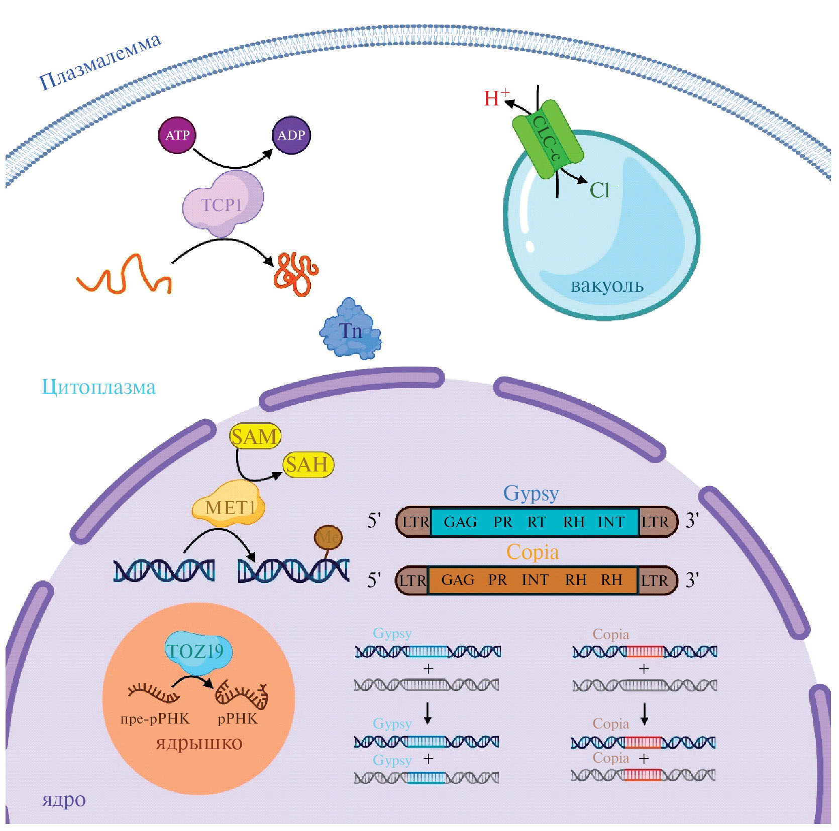 Рис. 2. Молекулярные функции некоторых не-RR генов, картированных в SDR тополей, и структура мобильных элементов SDR. К генам, находящимся как в X-, так и в Y-SDR, относятся TCP-1 – кодирует цитозольный шаперонин, CLC-c – протон-хлоридный антипортер на поверхности вакуоли, MET1 – ДНК-метилтрансфераза. У P. tremula полноразмерный ген TOZ19 имеется только на Y-SDR. В SDR в большом количестве встречаются мобильные элементы из суперсемейств Copia и Gypsy – LTR-RT, структурно они отличаются порядком расположения генов.