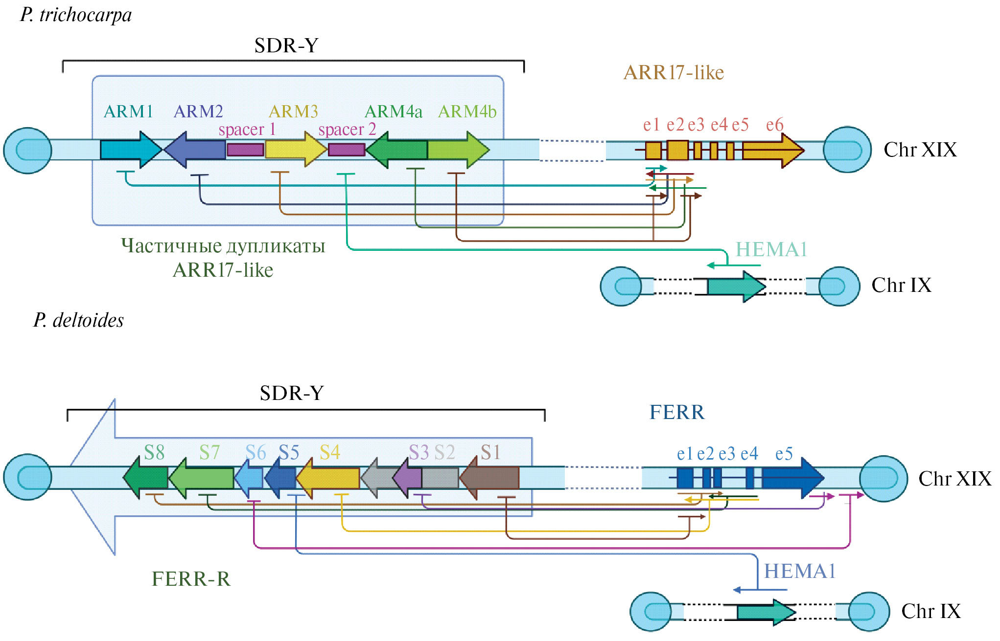Рис. 3. Молекулярно-генетические механизмы определения пола у представителей секции APL: P. trichocarpa и P. deltoides. Схематично представлены структуры Y-SDR и механизмы регуляции экспрессии ортологов ARR16/ARR17 у P. trichocarpa и P. deltoides. У обоих видов в субтеломерных участках хромосомы 19 находятся SDR. В SDR, расположенном на левом плече, локализованы частичные дупликаты ортологов ARR16/ARR17 (у P. deltoides эта область называется FERR-R), которые имеют общее эволюционное происхождение с находящимися на противоположном конце той же хромосомы ортологами ARR16/ARR17 (у P. deltoides этот ген называется FERR).