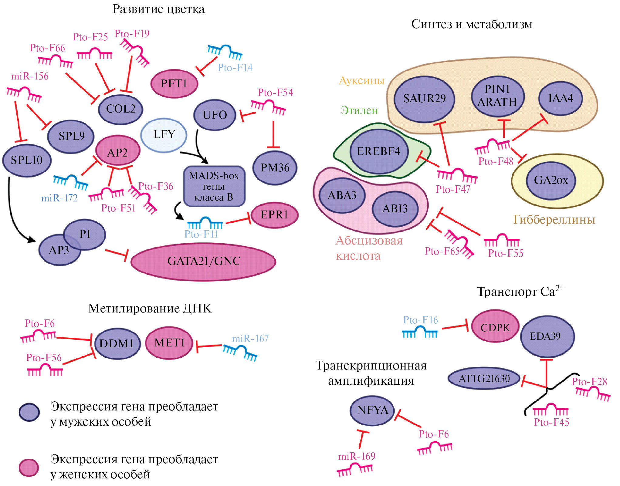 МикроРНК активно участвуют в регуляции экспрессии генов, опосредуя их метилирование. Имеются зависимые от пола отличия в структуре микроРНК: в мужских цветках P. tomentosa микроРНК состоит из 21 или 24 нуклеотидов, тогда как в женских преобладают микроРНК длиной 21 нуклеотид [90]. Кроме того, число микроРНК, экспрессируемых в женских цветках, больше, чем в мужских (94 против 40 в случае канонических микроРНК и 61 против 11 в случае новых микроРНК) [90]. Возможно, повышенное количество микроРНК вносит вклад в повышенный общий уровень метилирования генома, наблюдаемый в женских растениях [76]. В ходе картирования метилированных участков генома P. tomentosa установлено, что 15.1% прочтений приходится на гены, из которых 95.7% белоккодирующие, а остальные 4.3% – это гены микроРНК [91]. В белоккодирующих генах сильнее метилированы CpG-островки в промоторной области, а также тело гена, а в генах микроРНК – CHH-островки, а также 3’- и 5’-нетранслируемые области. Выявлены также половые различия в степени метилирования CHH-островков, которые чаще находятся в межгенных областях и сильнее всего метилированы у мужских растений. Половые различия в метилировании генов и межгенных участков могут быть связаны с дифференциальной экспрессией генов ДНК-метилтрансфераз, локализованных на половых хромосомах (например, MET1, DMT3 и DDM1 [76]). Наблюдается обратная зависимость между уровнем экспрессии микроРНК и их мишеней. Например, в женских растениях по сравнению с мужскими повышена экспрессия miR169-q, t, u (при этом понижена экспрессия мРНК их гена-мишени NFYA); miR-164a, e (и понижена – мРНК их мишеней CUC1 и CUC2); miR-159а, miR-319f (и понижена – мРНК их мишеней MYB33, MYB65, MYB101, TCP2, TCP3, TCP10, TCP24); понижена – экспрессия 172b, i (и повышена мРНК их мишени AP2); miR-156l, k (и понижена мРНК их мишеней SPL9, SPL10) [91]. Большая часть мишеней микроРНК связана с развитием цветка (COL2, AP2, UFO и PM36 негативно регулируются F-специфичными микроРНК; EPR1 и PFT1 негативно регулируются M-специфичными микроРНК). Следующая по количеству группа генов-мишеней связана с метаболизмом фитогормонов (PINI ARATH, IAA4, GA2ox, EREBF4, SAUR29, ABA3 и ABI3 негативно регулируются F-специфичными микроРНК), транспортом Ca2+ (EDA39 и AT1G21630 негативно регулируются F-специфичными микроРНК; CDP негативно регулируется M-специфичной микроРНК) и метилированием ДНК (три микроРНК; DDM1 негативно регулируются F-специфичными микроРНК; MET1 негативно регулируется M-специфичной miR167) (рис. 4). Следует отметить, что значительная часть мишеней микроРНК локализована на половой хромосоме 19.