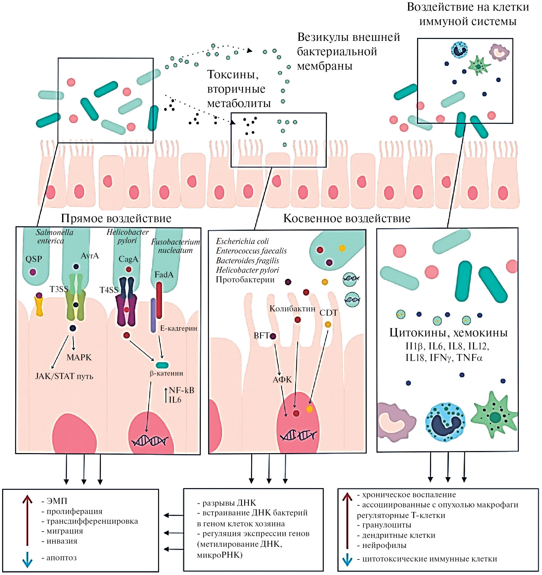 При прямом взаимодействии с клеткой хозяина бактерии секретируют токсины, связываются с мембранными рецепторами и индуцируют различные сигнальные каскады [3, 10]. Например, Fusobacterium nucleatum связывается с эпителиальными и эндотелиальными клетками хозяина через молекулу адгезии FadA (F. nucleatum adhesin A), тем самым обеспечивая индукцию провоспалительных сигнальных путей, опосредованных ядерным фактором NF-κB и IL6, и способствуя инвазии РПР [11, 12]. Кроме того, F. nucleatum может индуцировать эпителиально-мезенхимальный переход (ЭМП) [13]. Прямое взаимодействие между F. nucleatum и E-кадгерином приводит к повреждению ДНК, пролиферации эпителиальных клеток, приобретению ими стволовости и потере клеточной полярности за счет повышенной экспрессии E-кадгерина/β-катенин-индуцированных факторов транскрипции [14, 15]. Еще одна бактерия – Helicobacter pylori – вводит в эндотелиальную клетку цитотоксин CagA (Cytotoxin-associated gene A) с помощью системы секреции типа IV (T4SS, Type IV Secretion System) [16]. CagA связывается с E-кадгерином и вызывает накопление β-катенина, что, в свою очередь, приводит к трансдифференцировке эпителиальных клеток желудка и развитию предопухолевой кишечной метаплазии [17]. Бактерия Bacteroides fragilis секретирует металлопротеиназу BFT (Bacteroides Fragilis Toxin) и вызывает хроническое воспаление и повреждение тканей кишечника, изменяя плотные контакты клеток кишечника за счет расщепления E-кадгерина и активации сигнальных путей Wnt/β-катенин/NF-κB [18‒20]. Salmonella enterica с помощью системы секреции типа III (T3SS, Type III Secretion System) переносит в эпителиальные клетки эффекторный белок AvrA, который способствует активации сигнальных путей MAPK, Wnt/β-катенин и JAK/STAT, ЭМП, пролиферации, трансдифференцировке клеток, остановке клеточного цикла и ингибированию апоптоза [21, 22]. Bacillus sp., Enterococcus faecium и Escherichia coli продуцируют пептиды системы Quorum sensing (QSP), которые влияют на клетки эпителия хозяина через факторы роста, способствуют образованию опухолей и метастазированию опухолевых клеток [23]. Так, QSP, синтезированные Bacillus, способны индуцировать инвазию, ЭМП и ангиогенез [23, 24].