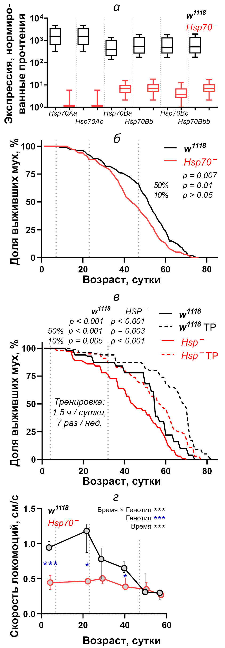 Рис. 1. Нокаут шести генов семейства Hsp70 снижает медианную продолжительность жизни D. melanogaster и оказывает выраженное негативное влияние на скорость локомоций в тесте на отрицательный геотаксис. а – Нормированное количество прочтений (РНК-секвенирование), приходящееся на открытую рамку считывания каждого гена. n = 12 пулов (ноги 15 мух) каждой линии. б и в – Доля выживших мух с обычным и хронически повышенным уровнем двигательной (локомоторной) активности. Представлено значение p для сравнения кривых, а также для медианной и максимальной продолжительности жизни (доля выживших 50 и 10%); n >150 в каждой линии. TP – тренировка. г – Возрастные изменения скорости локомоций в тесте на отрицательный геотаксис. Одной и тремя звездочками представлены значения p < 0.05 и < 0.001 соответственно. n = 5–6 пулов (10–30 мух в пуле) каждой линии.