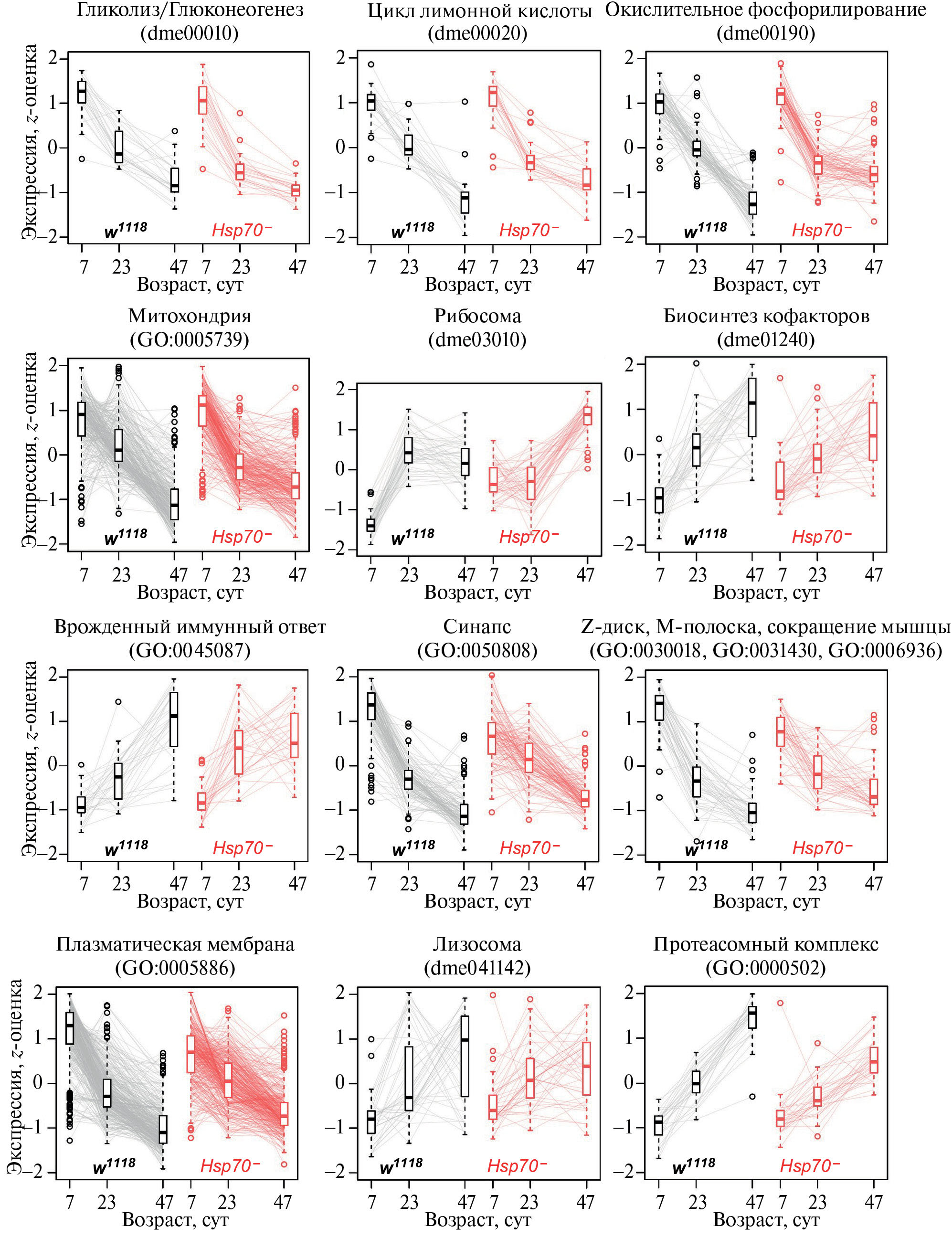 Изменения транскриптома у мух Hsp70– (47-суточных vs. 7-суточных) были несколько меньше, чем в контроле (~1000–1500 мРНК vs. ~1500–2000 мРНК соответственно; рис. 2а, табл. S1, см. Дополнительные материалы), при этом отмечено нарушение возрастной динамики экспрессии многих генов. Так, анализ функционального обогащения показал, что изменения экспрессии генов, кодирующих регуляторы трансляции, ферменты биосинтеза кофакторов, углеводного обмена (рис. 2б) и мембранные белки (рис. 2в), происходили в начальный период жизни мух линии w1118, тогда как в линии Hsp70– изменения экспрессии наблюдались с 23-х по 47-е сутки или отсутствовали. Обратная ситуация отмечена в случае генов иммунного ответа, белков цитоскелета (рис. 2б), митохондрий и регуляторов метаболизма лекарственных средств (рис. 2в). Анализ возрастной динамики экспрессии генов, относящихся к этим и некоторым другим функциональным категориям, подтвердил это наблюдение (рис. 3). Кроме того, совокупные возрастные изменения (47 vs. 7 суток) в экспрессии генов, кодирующих регуляторы трансляции, протеолиза (рис. 2б и рис. 3), метаболизма липидов и белки мотонейронов/синапсов, различались между линиями (рис. 2в и рис. 3). Суммарно эти данные показывают, что гены Hsp70 оказывают комплексное, но относительно небольшое влияние на возрастные изменения экспрессии множества генов в скелетных мышцах ног мух.