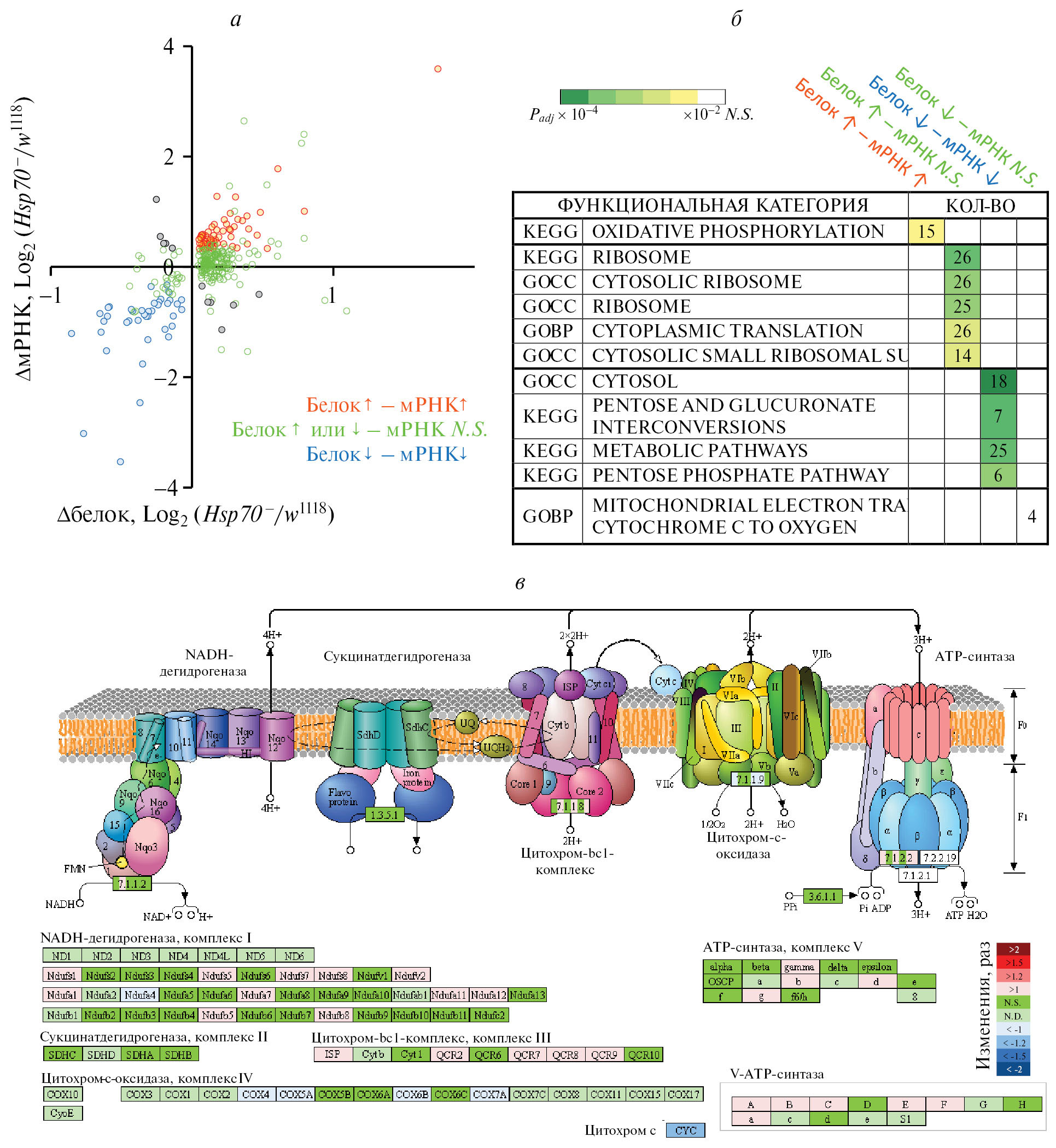 Рис. 4. Нокаут шести генов семейства Hsp70 вызывает разнонаправленные изменения в содержании ключевых ферментов метаболизма глюкозы и жиров (гликолиз, пентозофосфатный путь, цикл Кребса, бета-окисление и окислительное фосфорилирование) в мышцах ног 47-суточных мух. а – Изменения содержания мРНК и белка в скелетных мышцах ног мух Hsp70– относительно мух w1118. мРНК n = 4 пула (ноги 15 мух) каждой линии; белок n = 7–8 пулов (ноги 10 мух) для каждой линии. б – Анализ функционального обогащения показал, что белками с разным паттерном регуляции на уровне мРНК обогащены различные функциональные категории. Представлено количество генов в каждой категории; тепловая карта показывает значение p. в – Разнонаправленные изменения содержания белков окислительного фосфорилирования в ногах 47-суточных мух Hsp70– и мух w1118 (см. рис. S1, Дополнительные материалы). N.S. – изменение содержания белка не детектировано; N.D. – белок не детектирован.