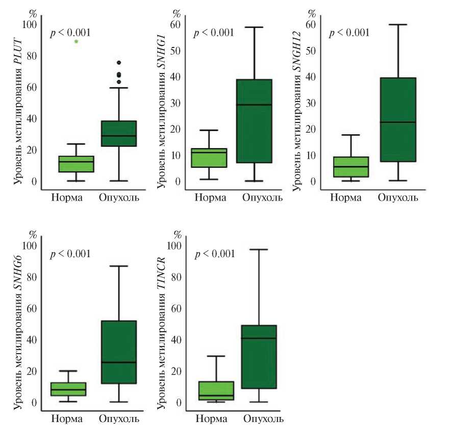Методом МС-ПЦР в реальном времени нами определен уровень метилирования пяти генов днРНК: PLUT, SNHG1, SNHG12 в 93 образцах РЯ, SNHG6 и TINCR – в 122 (см. табл. 1). С применением непараметрического критерия Манна–Уитни показано статистически высоко значимое (p < 0.001) повышение уровня метилирования всех пяти исследованных генов днРНК в опухолях. На рис. 1 представлены результаты сравнения уровней метилирования пяти генов днРНК.