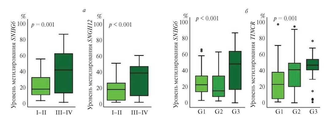 Рис. 2. Повышение уровня метилирования генов днРНК SNHG6 и SNHG12 на поздних стадиях РЯ (III, IV, 77 образцов) по сравнению с ранними стадиями РЯ (I–II, 45 образцов) (а); и генов днРНК SNHG6 и TINCR по мере увеличения степени злокачественности (G1-G2-G3) (б); для сравнения трех групп применен непараметрический критерий Краскала–Уоллиса.