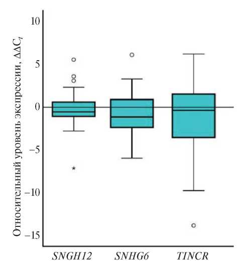 Рис. 4. Анализ уровней экспрессии генов днРНК SNHG6, SNHG12 (30 парных образцов РЯ) и TINCR (69 парных образцов РЯ) методом количественной ПЦР.