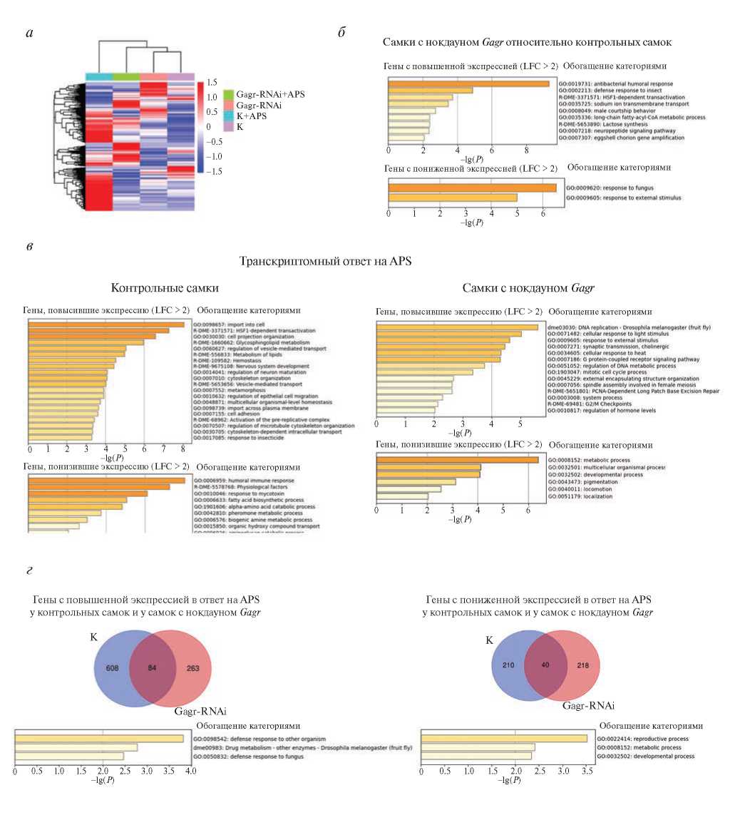 Рис. 1. Сравнительный анализ транскриптомов кишечника самок с нокдауном гена Gagr и контрольных самок. а – Тепловая карта и кластерный анализ транскриптомов кишечника самок с нокдауном гена Gagr и контрольных самок, культивированных в стандартных условиях и на среде с APS. б – Обогащение функциональными категориями генов с дифференциальной экспрессией (|LFC| > 2) в кишечнике самок с нокдауном гена Gagr относительно контрольной линии. На шкале абсцисс приведено отрицательное значение десятичного логарифма P-value для данной категории. в – Обогащение функциональными категориями генов с повышенной и пониженной транскрипцией при стрессовом ответе (|LFC| > 2) у контрольных самок и самок с нокдауном гена Gagr. г – Диаграммы Венна, показывающие количество общих генов, транскрипция которых изменилась при стрессовом ответе у контрольных самок (К) и самок с нокдауном Gagr (Gagr-RNAi), и их обогащение функциональными категориями.
