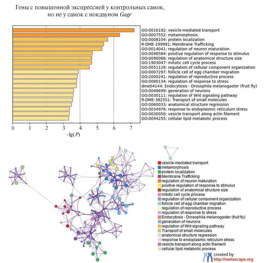 Рис. 2. Обогащение функциональными категориями генов с повышенной транскрипцией (LFC > 2) в кишечнике контрольных самок и не изменившими или понизившими транскрипцию в кишечнике самок с нокдауном Gagr (LFC < 0.5). Под диаграммой показана кластерная сеть функциональных категорий генов, построенная в программе Metascape (пояснения в тексте).