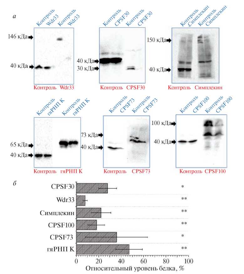 Радиоавтографы, полученные в результате нозерн-гибридизации, приведены на рис. 2. На каждой из дорожек видна полоса, соответствующая первичному неполиаденилированному транскрипту SINE, а выше – гетерогенные по длине РНК, представляющие собой полиаденилированные транскрипты SINE. Отношение интенсивности измеряемого при помощи фосфоимиджера радиоактивного сигнала полиаденилированных транскриптов к суммарной интенсивности полиаденилированных и неполиаденилированных транскриптов отражает эффективность полиаденилирования. Если нокдаун какого-либо белка влияет на эту эффективность, то должно наблюдаться значимое снижение доли полиаденилированых транскриптов.