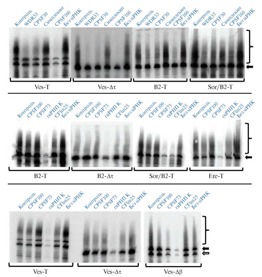 Рис. 2. Влияние нокдауна белков на полиаденилирование транскриптов SINE. Нозерн-блот-анализ РНК, выделенных из клеток HeLa, обработанных сначала siРНК (над дорожками указано, какими именно: контрольными (“Контроль”), против CPSF30, Wdr33, симплекина, CPSF100, CPSF73, гяРНП K, CFIm25, CPSF160 или оставшихся необработанными (“Без siРНК”) в течение 72 ч, а затем трансфицированных различными конструкциями на основе SINE Ves, B2 или Ere (их названия указаны под сериями дорожек). Нокдаун CPSF160 или CFIm25 проведен в качестве положительного контроля на снижение полиаденилирования транскриптов. Черными стрелкам помечены первичные транскрипты, а фигурными скобками – полиаденилированные транскрипты; белая стрелка указывает на характерный для Ves укороченный транскрипт, образующийся вследствие терминации транскрипции на неоптимальном терминаторе и не способный к полиаденилированию. Одна из дорожек на правом нижнем блоте – гяРНП K (48) – соответствует опыту, в котором трансфекция плазмидами проведена спустя 48 ч после начала обработки клеток siРНК к гяРНП K. Время обработки сокращено с целью уменьшения цитотоксического действия данных siРНК.