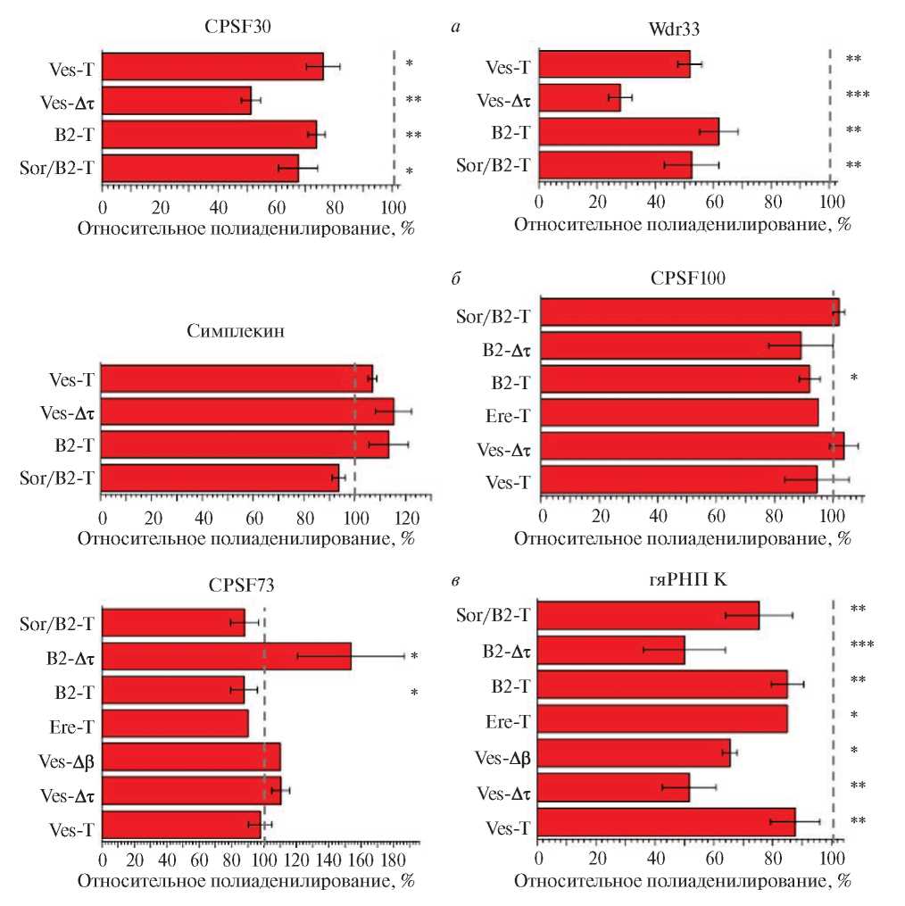 Рис. 3. Диаграммы, иллюстрирующие количественное влияние нокдауна различных белков на полиаденилирование транскриптов конструкций SINE B2, Ves и Ere, содержащих только τ-сигнал (–Δβ), только β-сигнал (–Δτ) или оба сигнала (–T, дикий тип). Показан средний уровень полиаденилирования транскриптов каждой конструкции (названия указаны слева от диаграммы) в клетках, трансфицированных специфическими siРНК, относительно уровня полиаденилирования в клетках, обработанных контрольной siРНК (этот уровень принят за 100% и отмечен вертикальной пунктирной линией). Стандартное отклонение получено по результатам трех опытов; *, ** и *** – p < 0.05, < 0.01 и < 0.001 соответственно (t-критерий). a – Компоненты субкомплекса mPSF: CPSF30 и Wdr33. б – Компоненты субкомплекса mCF: симплекин, CPSF100 и CPSF73. в – Белок гяРНП K.