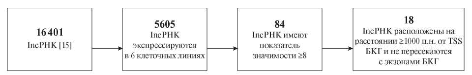 Рис. 2. Этапы отбора lncРНК с указанием критериев отбора и количества выбранных генов на каждом этапе. Обозначения: БКГ – белоккодирующие гены, TSS (transcription start site) – сайт начала транскрипции.