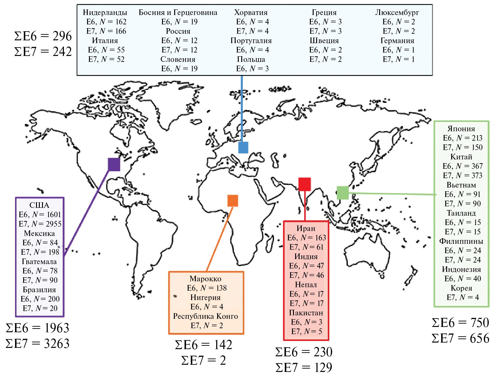 В общей сложности нами проанализирована 3 651 нуклеотидная последовательность, кодирующая белок E6 ВПЧ16, из 29 стран и 4 578 нуклеотидных последовательностей, кодирующих белок E7, из 23 стран. Все страны оказались распределены по 5 регионам мира: Европе, Африке, Америке, Юго-Западной и Южной Азии, а также Юго-Восточной Азии (рис. 1).