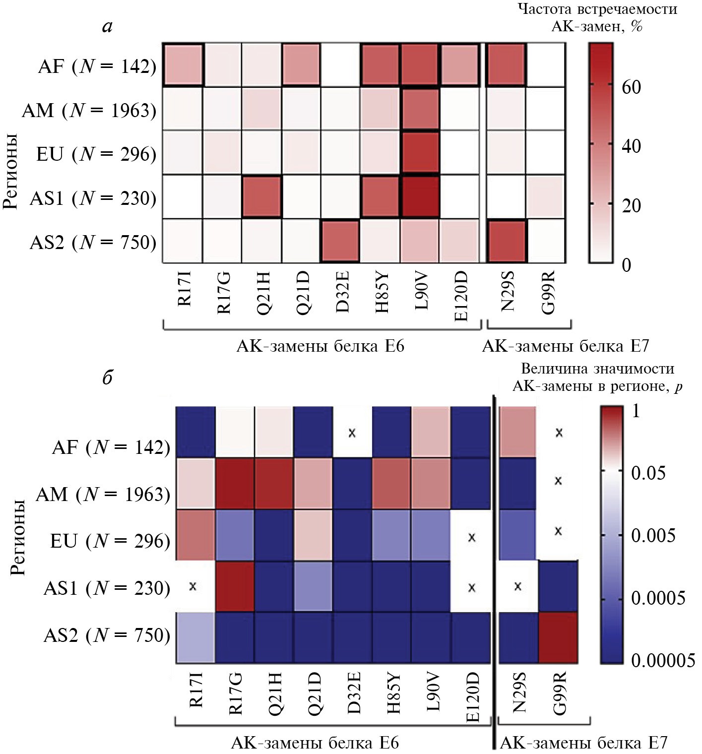 Рис. 3. Тепловые карты встречаемости АК-замен в пяти основных географических регионах мира. Карта распределения частот встречаемости: паттерн АК-замен в белках E6 и E7, цветовая шкала справа отражают частоту встречаемости замены для региона; обведены ячейки с частотой встречаемости >20% (а). Карта значимости АК-замены в белках E6 и E7 для региона при попарном сравнении с частотой встречаемости данной замены в общей популяции. Цветовая шкала справа отражает величину значимости, р. Сравнение проводили с использованием критерия Фишер (б). Тепловые карты сделаны с помощью языка R с визуализацией через Rstudio. Отметка “x” означает отсутствие АК-замены в регионе, поэтому сравнение не проводили.