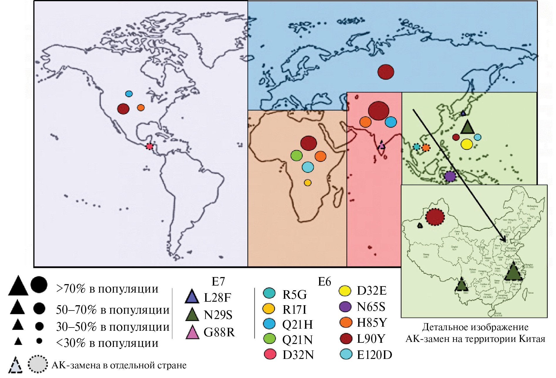 В США и странах Центральной и Южной Америки (AM) наиболее распространенными в белке E6 были замены L90V (46.1%, p = 0.0020), H85Y (15.2%, p = 0.0582), а также Q21H, хотя частота ее встречаемости достоверно не превышала этот показатель в других позициях (11.6%, p = 0.2425; табл. 2, риc. 3).