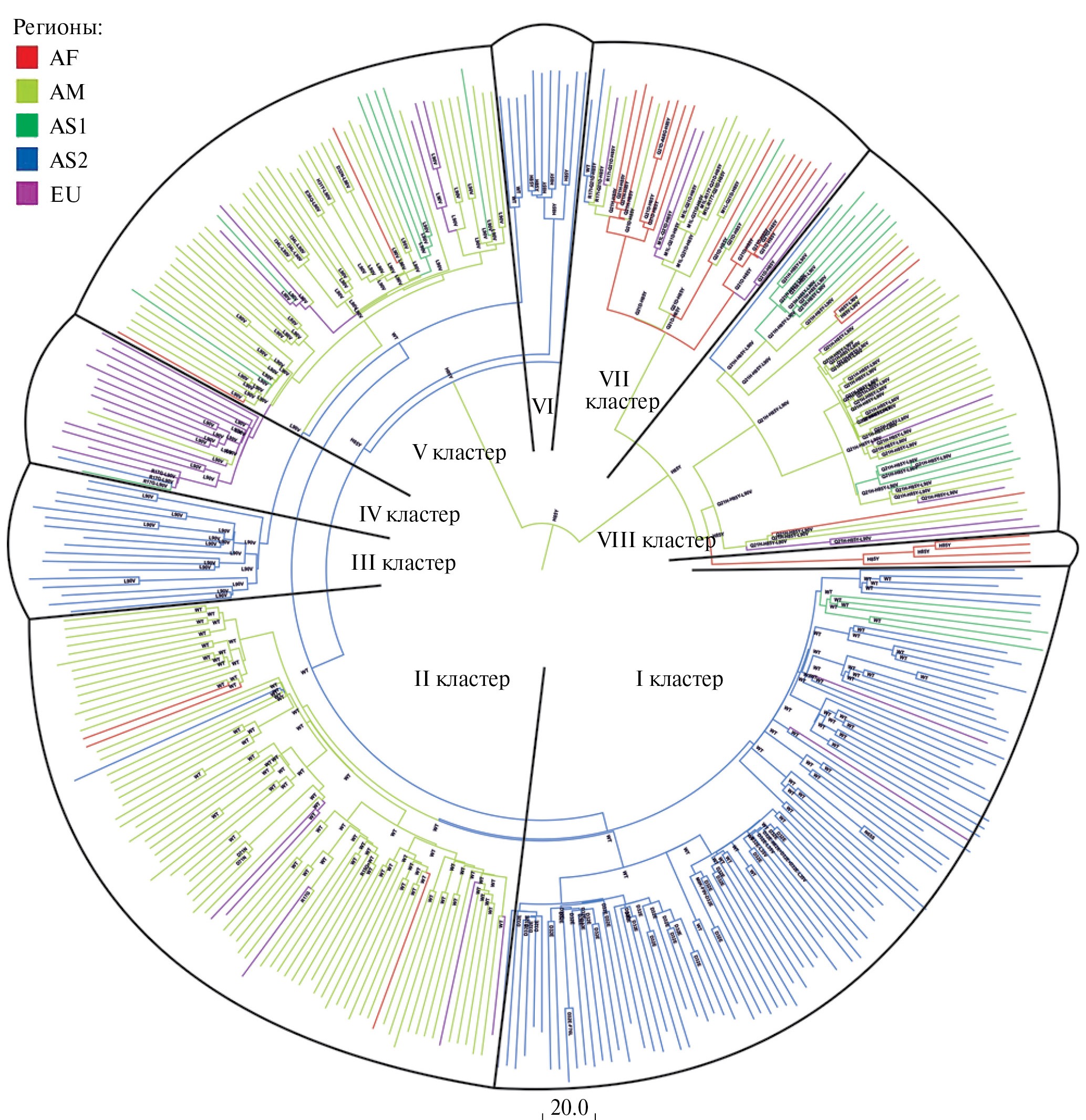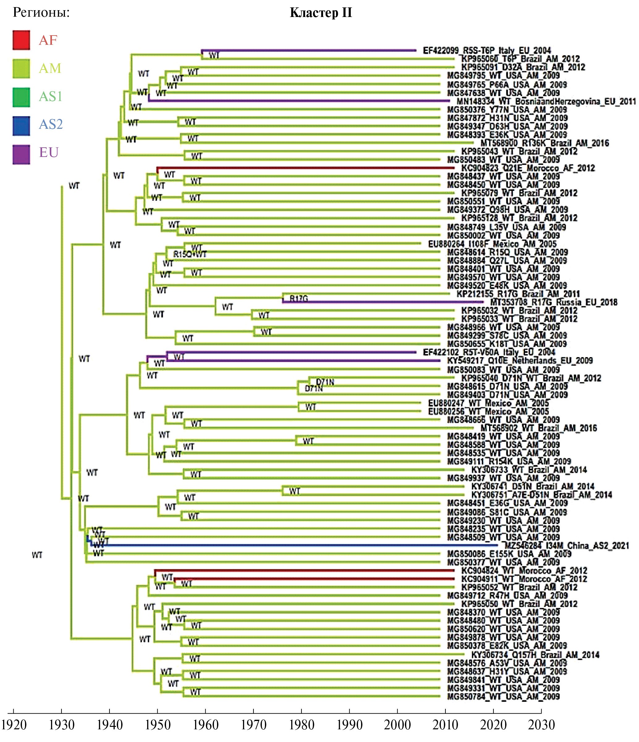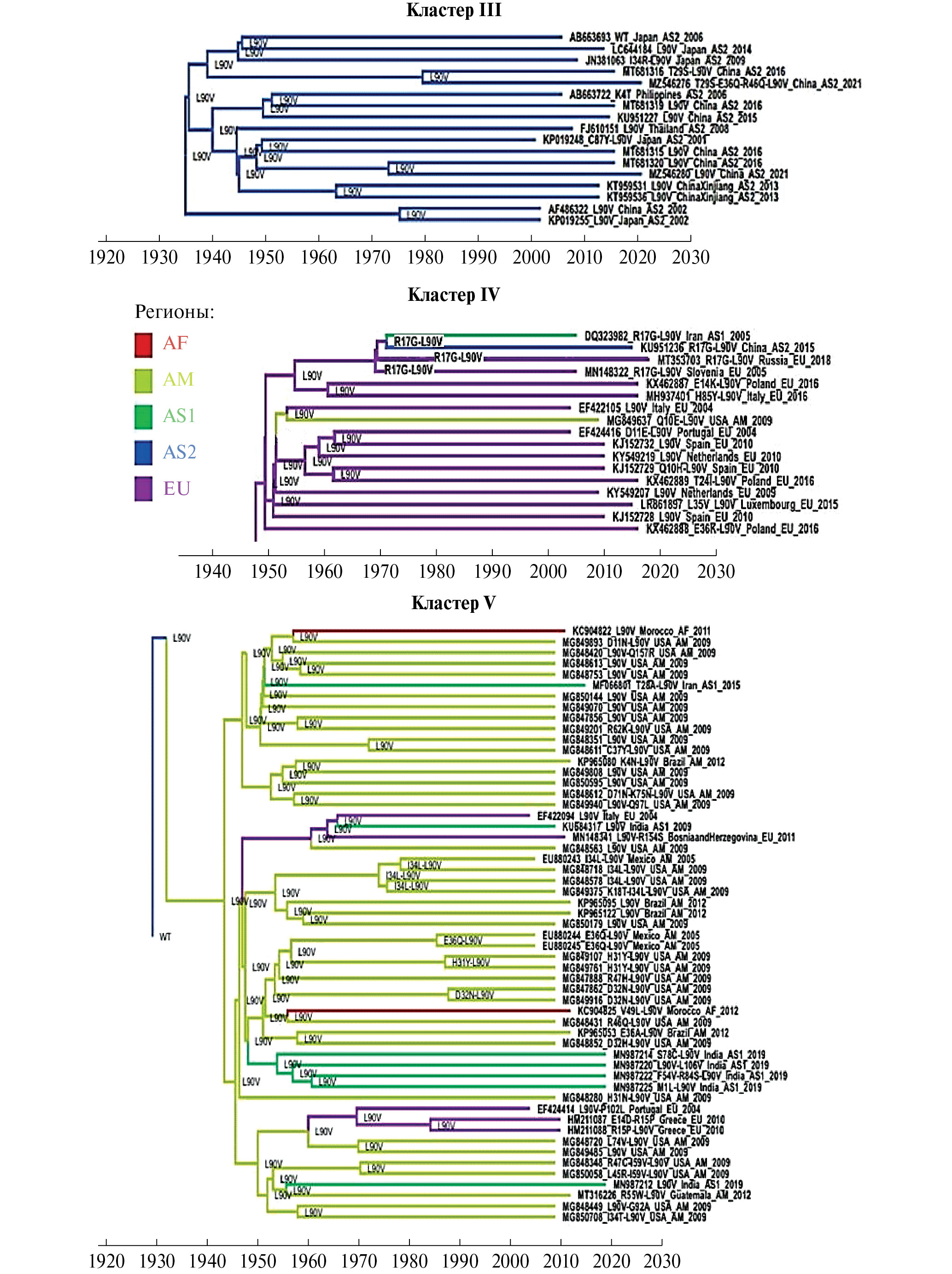 Параллельно с этим, среди изолятов, происходящих от общего предка с АК-заменой L90V, в 1930‒1940 гг. (HPD 95%: 1894–1979 гг.) произошло четкое разделение на образцы американской группы и азиатской типа 2 (рис. 6, кластеры III и V). Как и среди изолятов первой ветви, из образцов американского происхождения второй ветви в 1950 году отделилась группа AS2 (рис. 6, кластер V). Примерно в это же время отделилась и европейская группа (HPD 95%: 1967–1969 гг.; рис. 6, кластер IV).