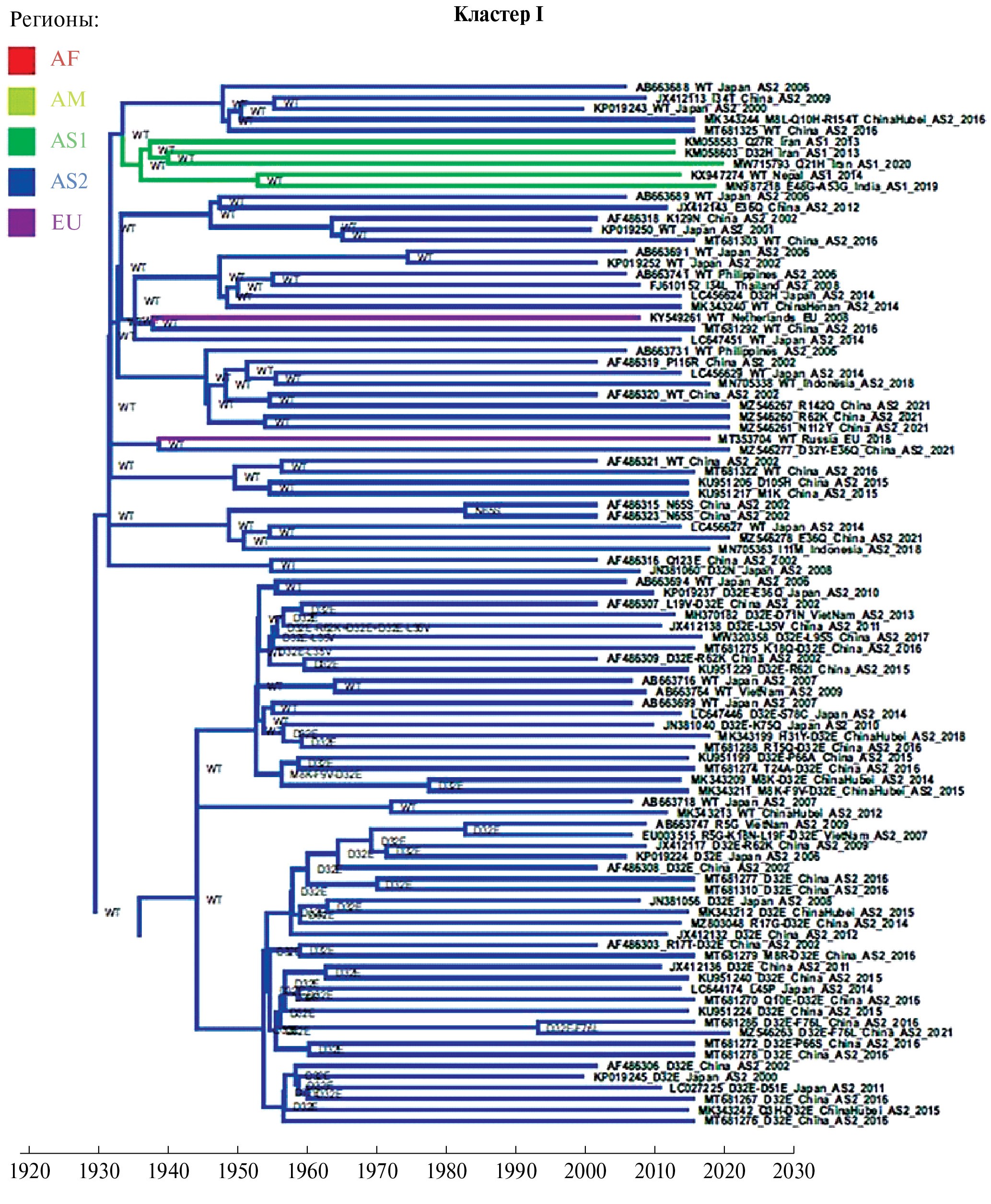 Также в 1920 году (HPD 95%: 1860–1975 гг.) произошло знаковое разделение изолятов второй ветви, что сопровождалось изменением аминокислотного состава – появлением L90V вне зависимости от географического распределения. Позднее, в 1930 году (HPD 95%: 1893–1978 гг.), произошло выделение группы AS2 (рис. 6). Примерно в это же время, в 1930 г. (HPD 95%: 1943–1964 гг.), среди обширной группы изолятов ВПЧ16 с белком E6 без замены L90V четко выделилась группа AS2 с группоспецифической заменой D32E и американская ветвь (рис. 6, кластеры I и II).