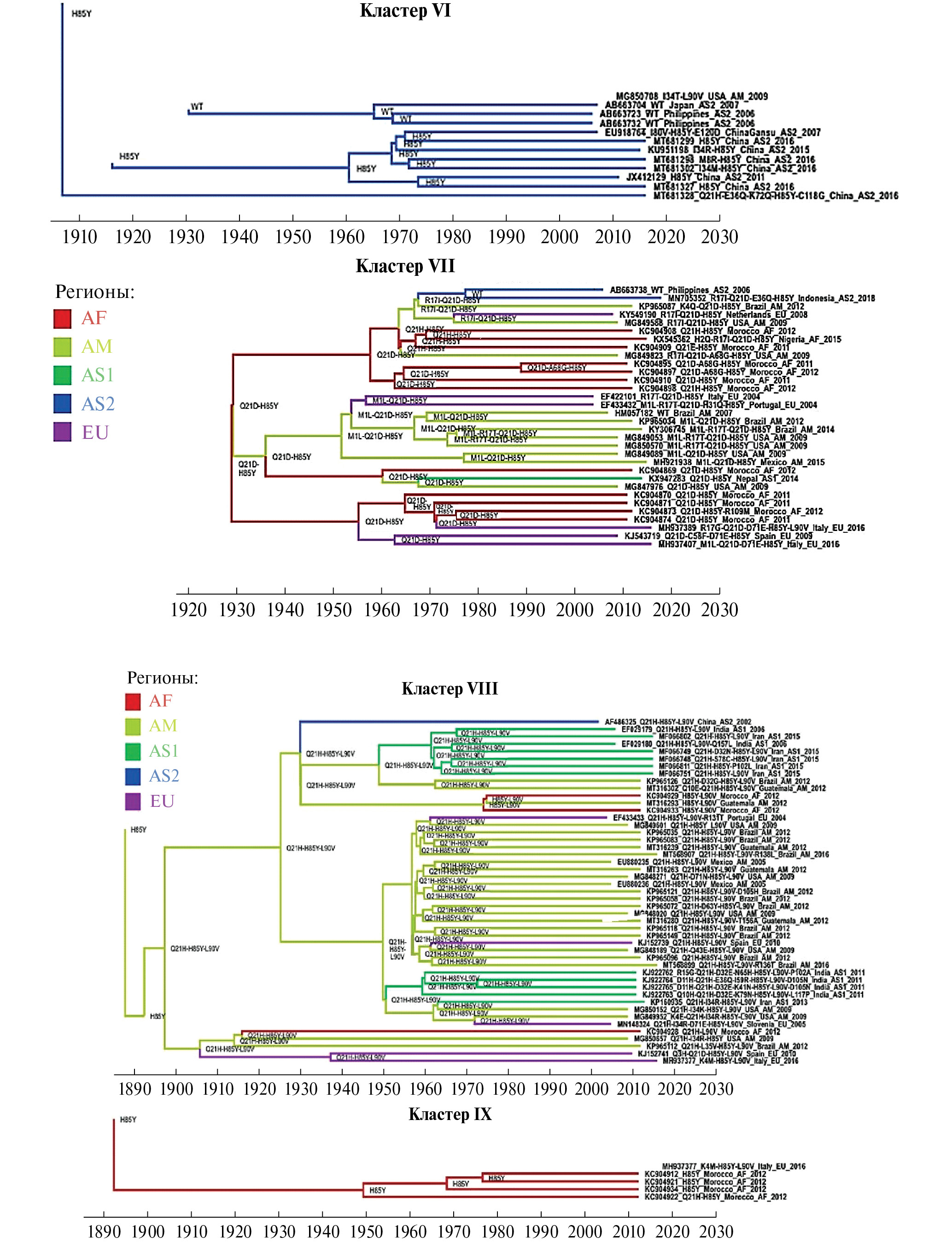 Для изолятов второй ветви, образованной от общего предка в 1840–1850 гг., характерна более четкая кластеризация по географическому признаку (рис. 6). Обращает внимание раннее выделение небольшой группы китайского происхождения из 7 образцов в 1905–1910 гг. (HPD 95%: 1822–1972 гг.) (рис. 6, кластер VI), что может быть обусловлено завозом штаммов ВПЧ16 из Китая и дальнейшим распространением в американской популяции. Эта гипотеза подтверждена при анализе аминокислотного состава этой группы изолятов, а именно сохранением замены H85Y; в то время как в большинстве образцов, происходящих от второй ветви, произошла реверсивная замена. В отличие от H85Y, замена L90V, возникшая еще у гипотетического предка, сохранилась как в американском, так и в азиатском кластере, что позволяет считать ее не связанной с этносом.