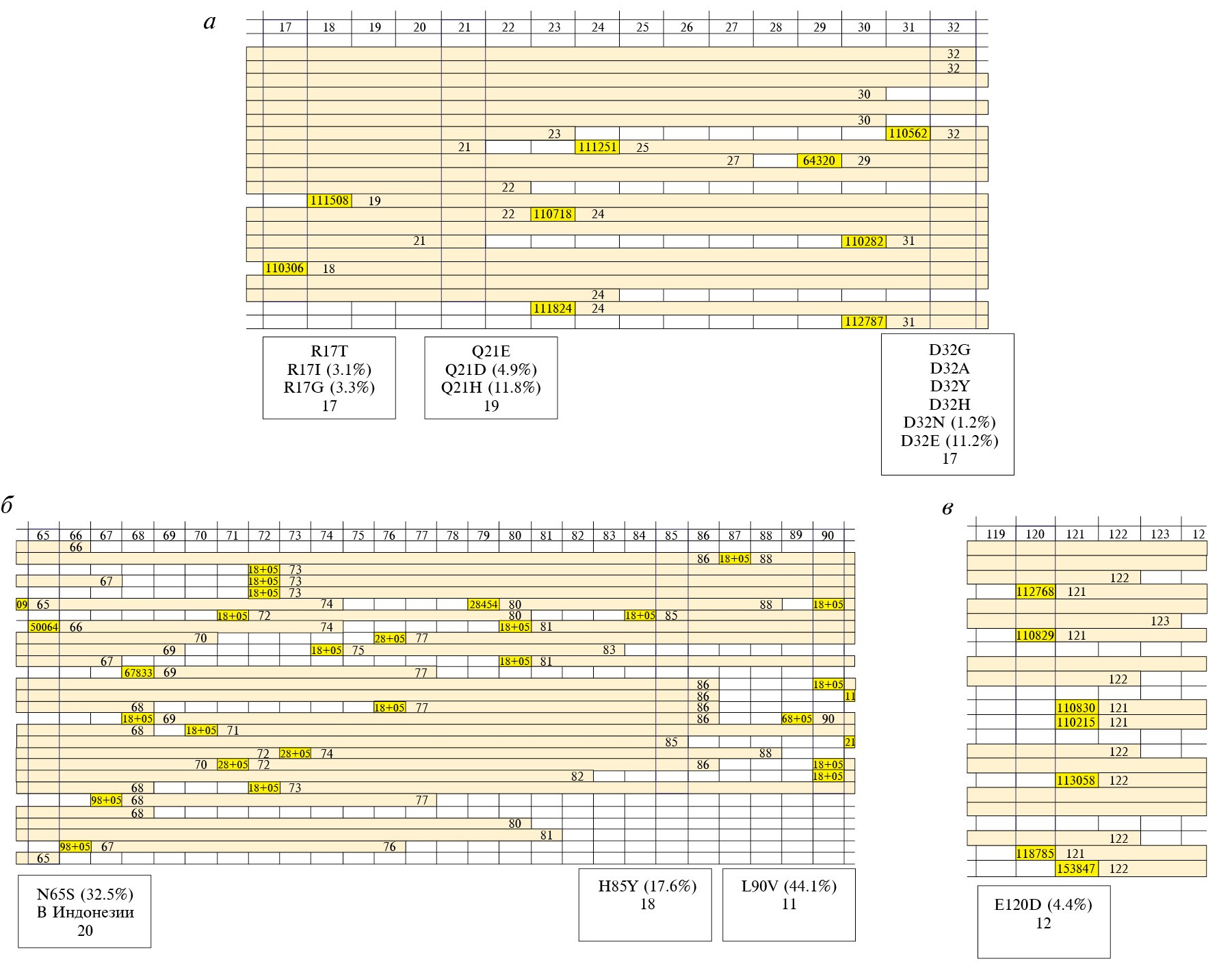 В 170 из 356 (47.8%) анализируемых образцов E6 выявлено не менее двух АК-замен (рис. 2в). Заметим, что среди последовательностей одновременно с двумя АК-заменами наиболее частым было их сочетание в позициях 21 и 85, а также различные тандемы с аминокислотой валин в позиции 90. Стоит отметить, что сочетание замен в позициях 85 и 90 встречалось крайне редко. Среди трех и более замен чаще встречалась комбинация Q21H, H85Y и L90V.