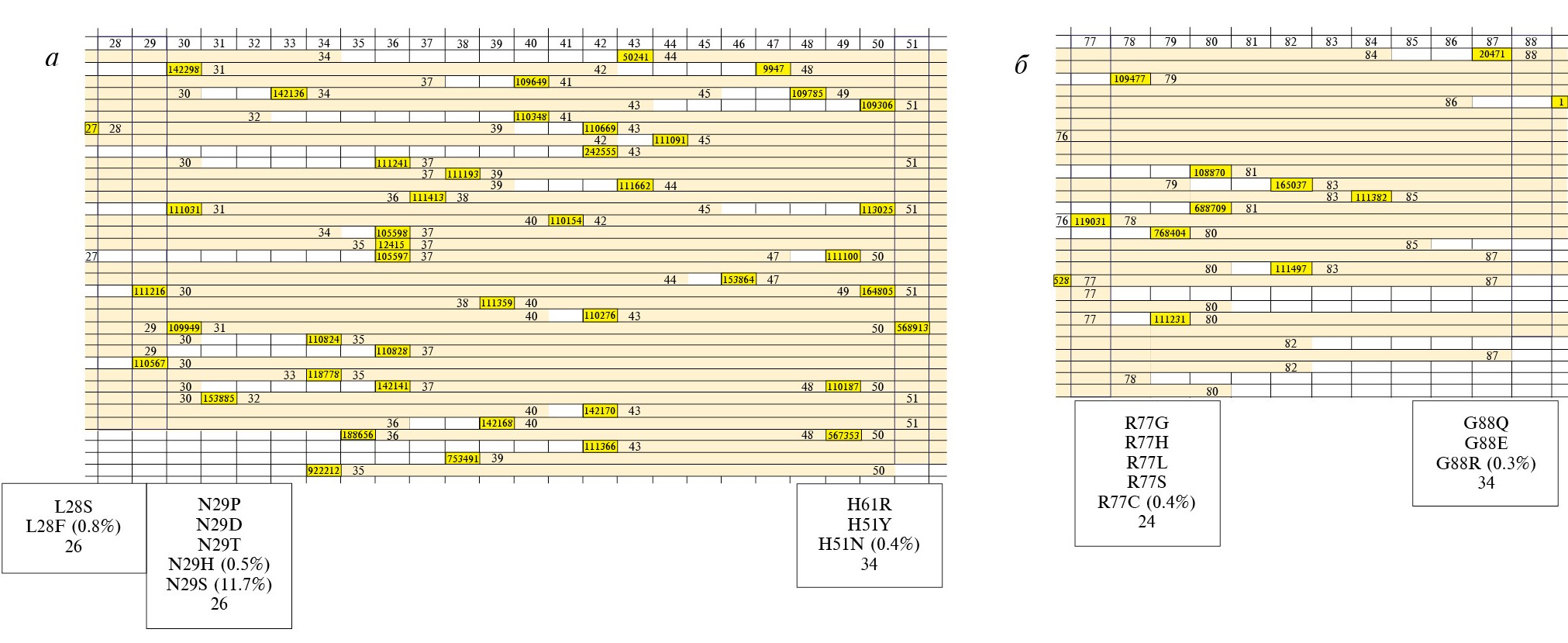Рис. 8. Эпитопная карта онкобелка E7. Представлены фрагменты 28‒51 (а) и 52‒99 (б) аминокислотной последовательности. Выборка включала последовательности, идентичность которых превышала 99.8%. Желтым цветом обозначены идентификационные номера (ID) эпитопов в базе данных IEDB, светло-желтым – последовательность картированного эпитопа, цифры внутри блока – позиции первых и последних аминокислотных остатков. В рамке внизу каждого блока указаны частоты встречаемости АК-замен в вариабельной позиции белка E7 в составе эпитопного кластера. Цифры внизу ‒ суммарное число эпитопов, затрагиваемых АК-заменами в указанных позициях.