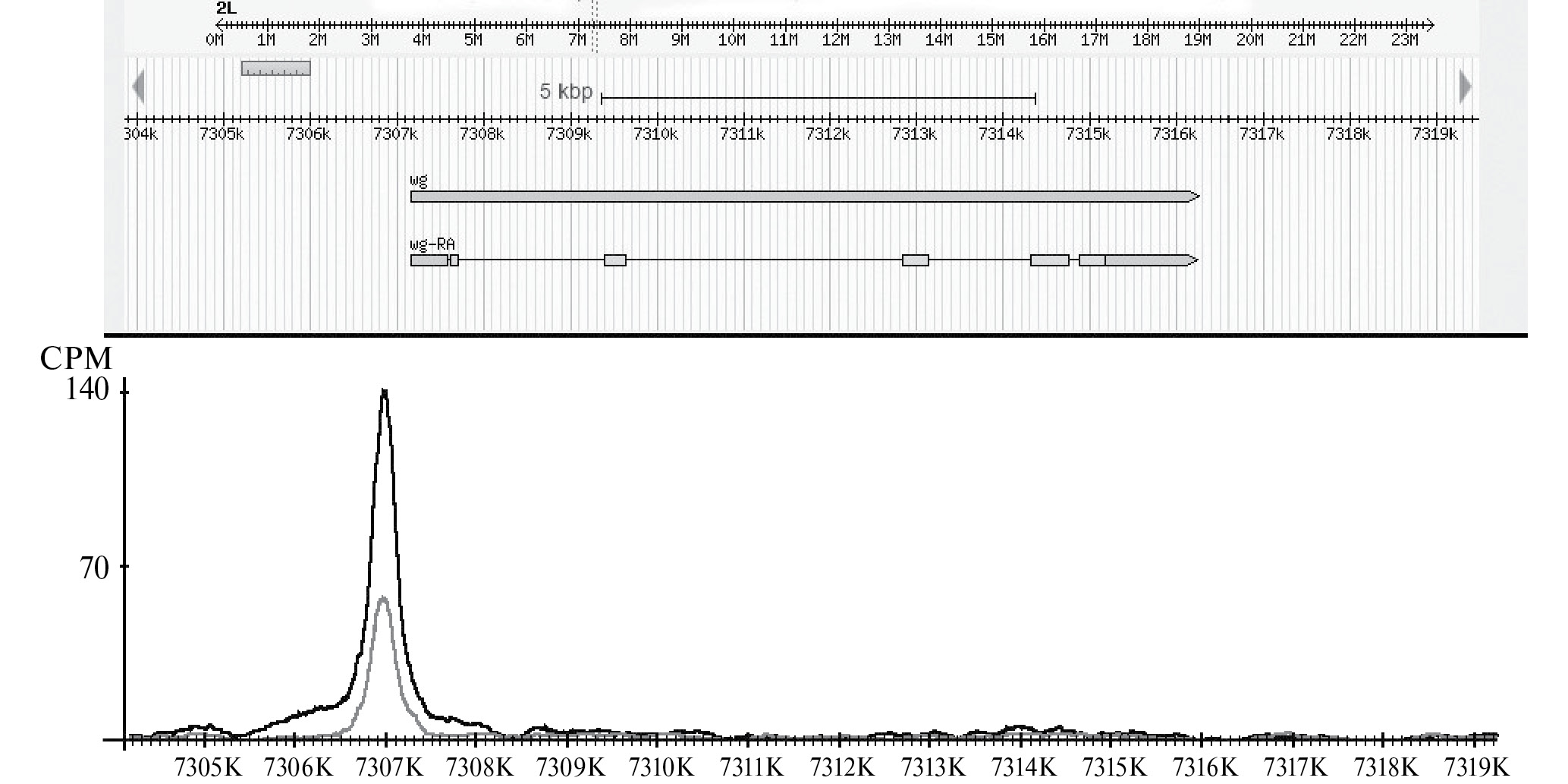 Рис. 2. ChIP-Seq профили белков CG10543 (черный) и Aef1 (серый) в области генa wg. На верхней панели представлена структура гена из геномного браузера. На нижней панели представлены ChIP-Seq профили в единицах CPM.