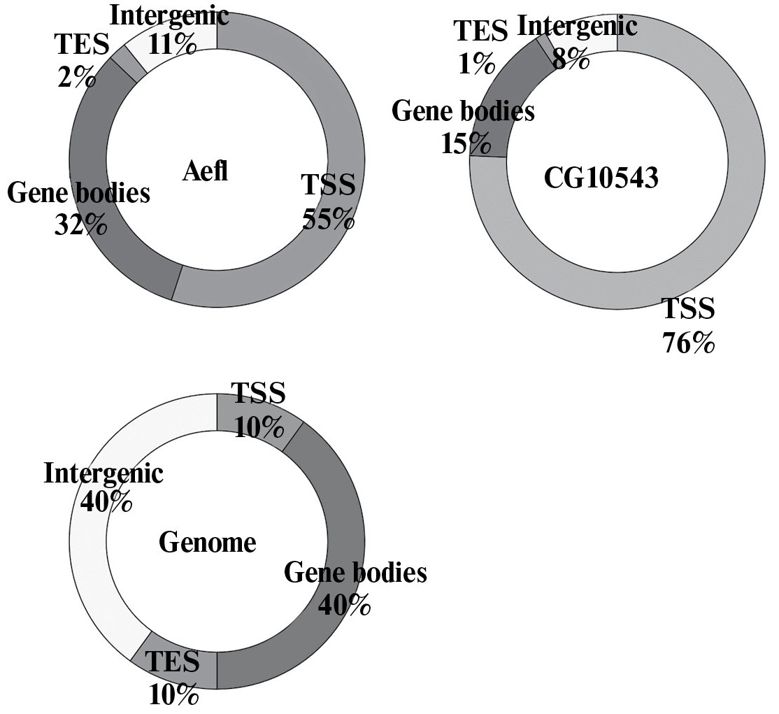 Анализ распределения сайтов связывания белков Aef1 и CG10543 в геноме. Геном разбивали на точки начала транскрипции (TSS), точки терминации транскрипции (TES), транскрибируемые области (участки генов за исключением TSS и TES) и межгенные области (все остальное). Областью TSS считали интервал ±500 п. н. от старта транскрипции. Областью TES считали интервал ±500 п. н. от точки терминации транскрипции. Данные области определяли из аннотации транскриптов генома дрозофилы dmel_r6.40. Считали, что сайт связывания находится в данной области, если пик сайта связывания попадает в заданный интервал.