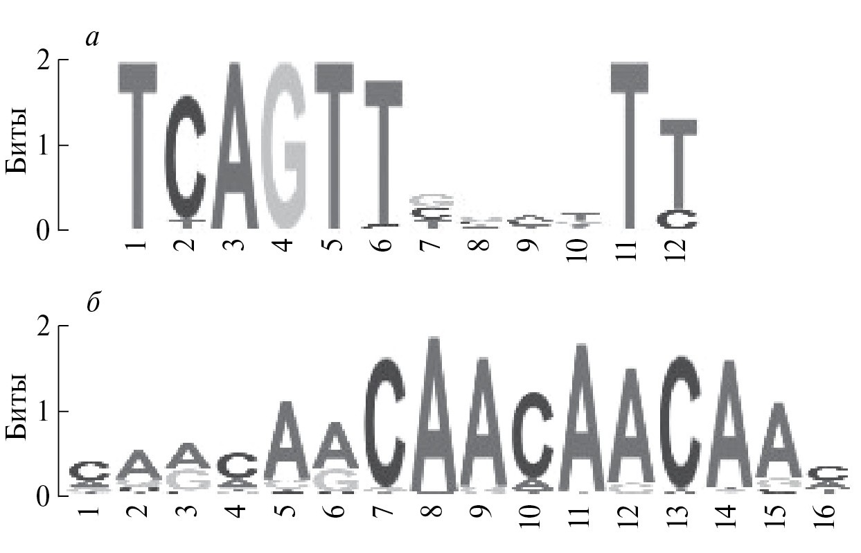 Рис. 4. Консенсусная последовательность потенциального сайта связывания белков CG10543 (a) и Aef1 (б).