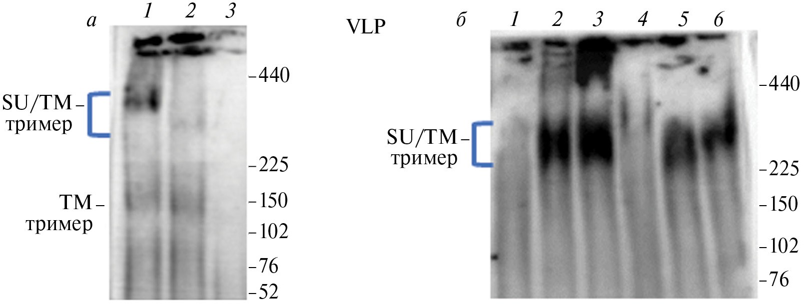 Электрофорез Blue Native в полиакриламидном геле (BN-PAGE). Для анализа Env в составе VLP при невосстанавливающих условиях использовали модифицированный протокол BN-PAGE [21]. Для высвобождения Env VLP инкубировали с равным объемом буфера, содержащего 0.12% Triton X-100, 1 мМ EDTA, 1.5 М аминокапроновой кислоты и 1 мкл коктейля ингибиторов протеаз (#04693132001, “Sigma-Aldrich”) в течение 5 мин, после чего вносили равный объем буфера для образцов, содержащего 100 мМ морфолинпропансульфоновой кислоты (MOPS), 100 мМ Трис-HCl, pH 7.7, 40% глицерина и 0.1% Coomassie Brilliant Blue. Образцы загружали в гель Bis-Tris NuPAGE с концентрацией полиакриламида от 4 до 12% (“Invitrogen”, США). В качестве маркера использовали ферритин (“Amersham Biosciences”, США). Электрофорез проводили при 4°C в течение 3 ч при 100 В с использованием в качестве катодного буфера 50 мМ MOPS/50 мМ Трис, pH 7.7, 0.002% Coomassie Brilliant Blue, а в качестве анодного – тот же буфер без Coomassie. По окончании процесса белки с геля переносили на PVDF-мембрану с использованием Trans-Blot® TurboTM Transfer System (#1704150, “Bio-Rad Laboratories”, США).