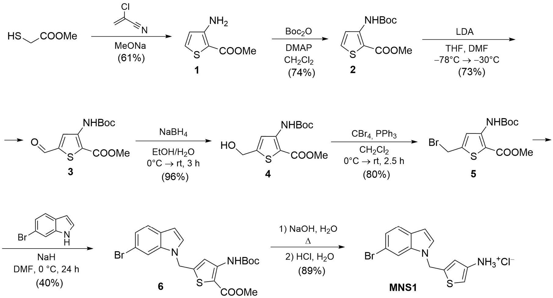 Рис. 1. Схема синтеза гидрохлорида 3-амино-5-[(6-бром-1H-индол-1-ил)метил]тиофена (MNS1). Обозначения: MeONa — метилат натрия, Boc — трет-бутилоксикарбонил, DMAP — 4-диметиламинопиридин, DMF — диметилформамид, LDA — диизопропиламид лития, THF — тетрагидрофуран, rt — комнатная температура, Δ — кипячение.