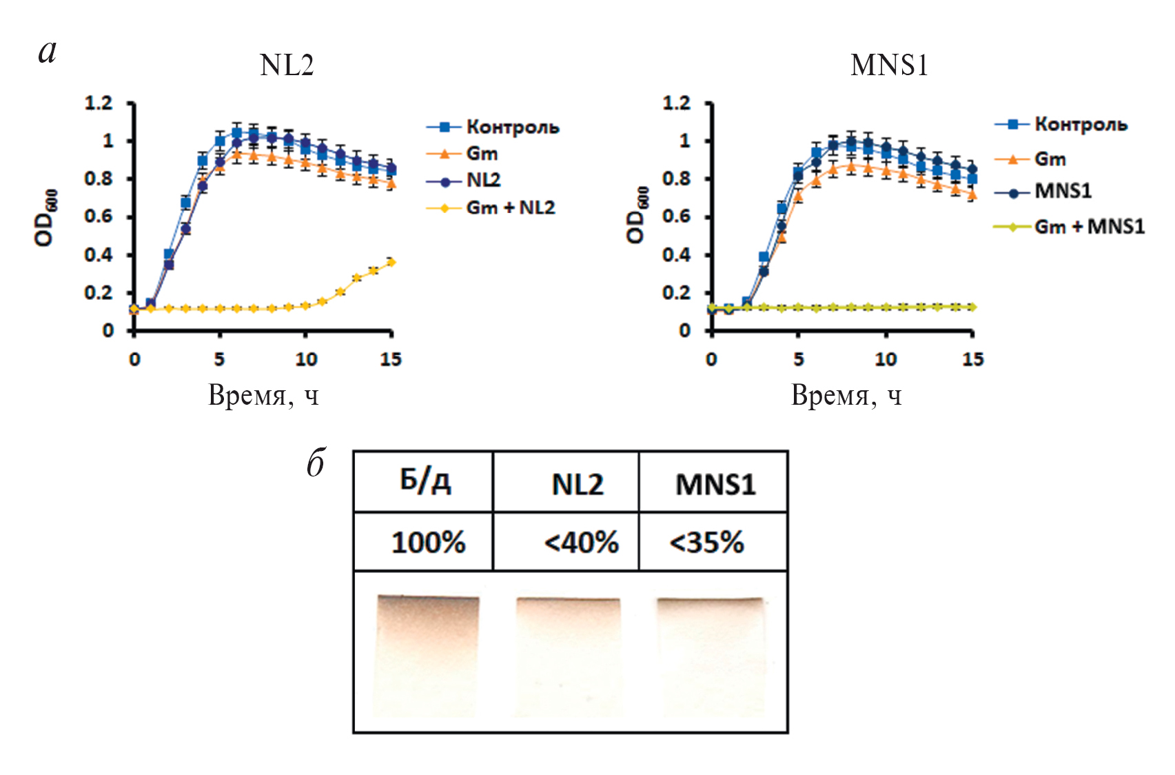 Рис. 2. Сравнительный анализ NL2 и MNS1 как потенциаторов гентамицина в отношении штамма B. subtilis 168. a ‒ Репрезентативные кривые роста штамма B. subtilis 168 в присутствии 0.1 мкг/мл гентамицина (Gm), а также 50 мкМ NL2 или MNS1. Клетки растили при 37°C с аэрацией в автоматизированной системе анализа роста Bioscreen C. Результаты представлены как средние значения ± стандартное отклонение, рассчитанные на основании трех повторов в одном эксперименте. б – Анализ генерации H2S клетками B. subtilis 168 в присутствии NL2 и MNS1. На пропитанных 2%-ным раствором ацетата свинца полосках фильтровальной бумаги появляется коричневое окрашивание, вызванное образованием соли PbS в результате испарения H2S бактериальной суспензией. Цифрами указаны изменения в продукции H2S относительно контрольных клеток.