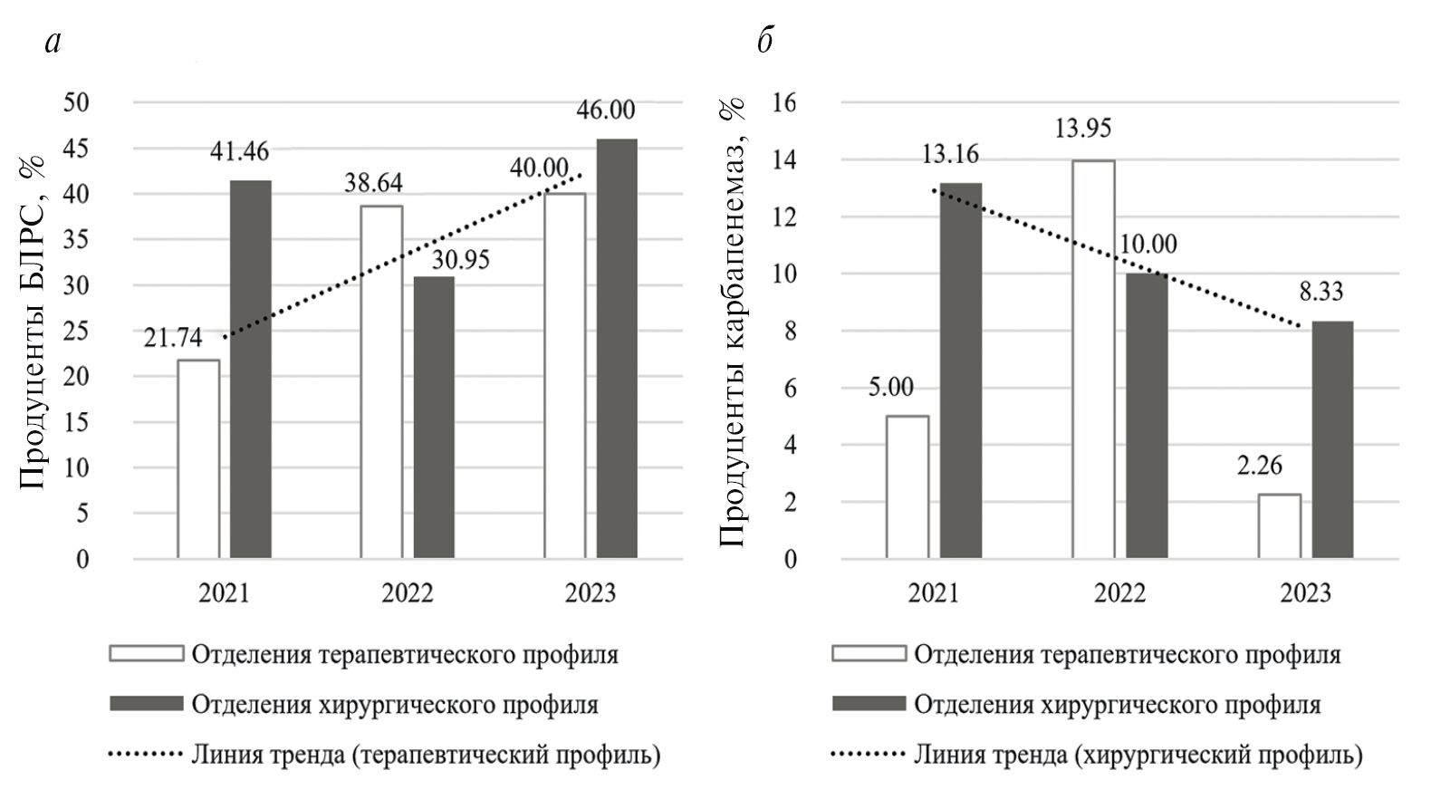 Статистически значимых изменений в доле продуцентов БЛРС и карбапенемаз за период исследования нами не выявлено (p > 0.05) (рис. 4). Однако можно заметить, что доля Enterobacterales с продукцией БЛРС в отделениях терапевтического профиля за три года выросла на 18.26% от исходных 21.74% (достигла 46%), а доля продуцентов карбапенемаз в отделениях хирургического профиля за это время снизилась на 4.83% от исходных 13.16% (до 8.33%).