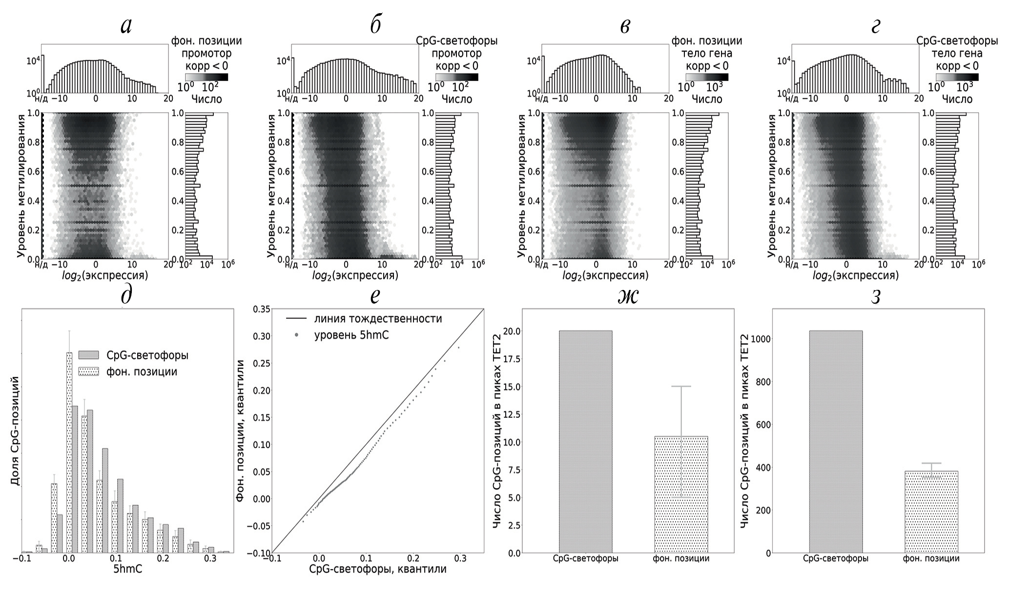 Рис. 1. Распределение метилирования и экспрессии генов, ассоциированных с CpG-светофорами и фоновыми позициями с отрицательным коэффициентом корреляции Спирмена. Тон отражает плотность точек в логарифмическом масштабе. Распределение показано для случайных фоновых CpG-позиций в промоторе (число позиций равно числу CpG-светофоров) (а); CpG-светофоров в промоторе (б); случайных фоновых CpG-позиций в теле гена (в); CpG-светофоров в теле гена [+500, TTS] (г). На панели (д) показано распределение доли CpG-светофоров и фоновых CpG-позиций в зависимости от уровня 5hmC в образце мозжечка; на панели (е) — квантили распределения (д). На панелях (ж) и (з) показано число CpG-позиций, колокализованных с пиками сигнала TET2 в двух различных образцах соответственно: дифференцированных на 12 сутки нейронах (клетки NPC) и макрофагов, полученных из моноцитов. Здесь и далее на рисунках: планки погрешностей соответствуют 5%- и 95%-ному процентилю из 50 выборок фоновых позиций; для фоновых позиций приведена медиана из 50 выборок; фон. позиции — фоновые позиции; корр — коэффициент корреляции Спирмена.