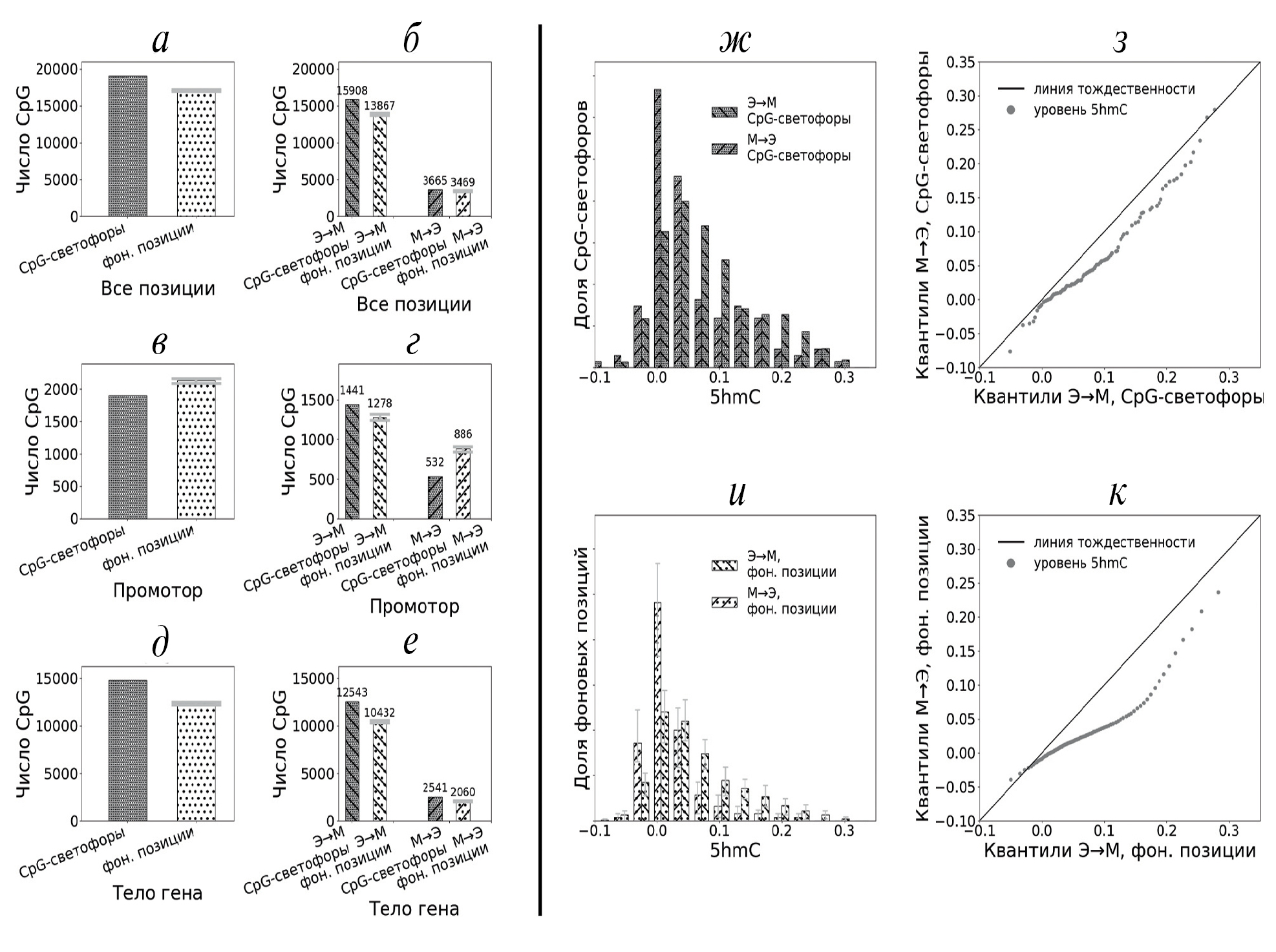 С целью лучше понять процесс деметилирования ДНК мы проанализировали уровень 5hmC в свете причинно-следственных связей между уровнями метилирования ДНК и экспрессии. Заметим, что именно CpG-позиции с направлением причинно-следственной связи Э→М обогащены 5hmC (рис. 2ж, и). Это может означать наличие положительной обратной связи между активной транскрипцией и деметилированием ДНК. Для наглядности мы привели квантиль-квантильные распределения (рис. 2з, к), которые показывают разницу распределений при разных направлениях причинно-следственной связи. Отметим, что разница между фоновыми CpG-позициями и CpG-светофорами с направлением связи М→Э (рис. S3а, б, см. электронное приложение) более выражена, чем для всех позиций в целом (рис. 1д, е).