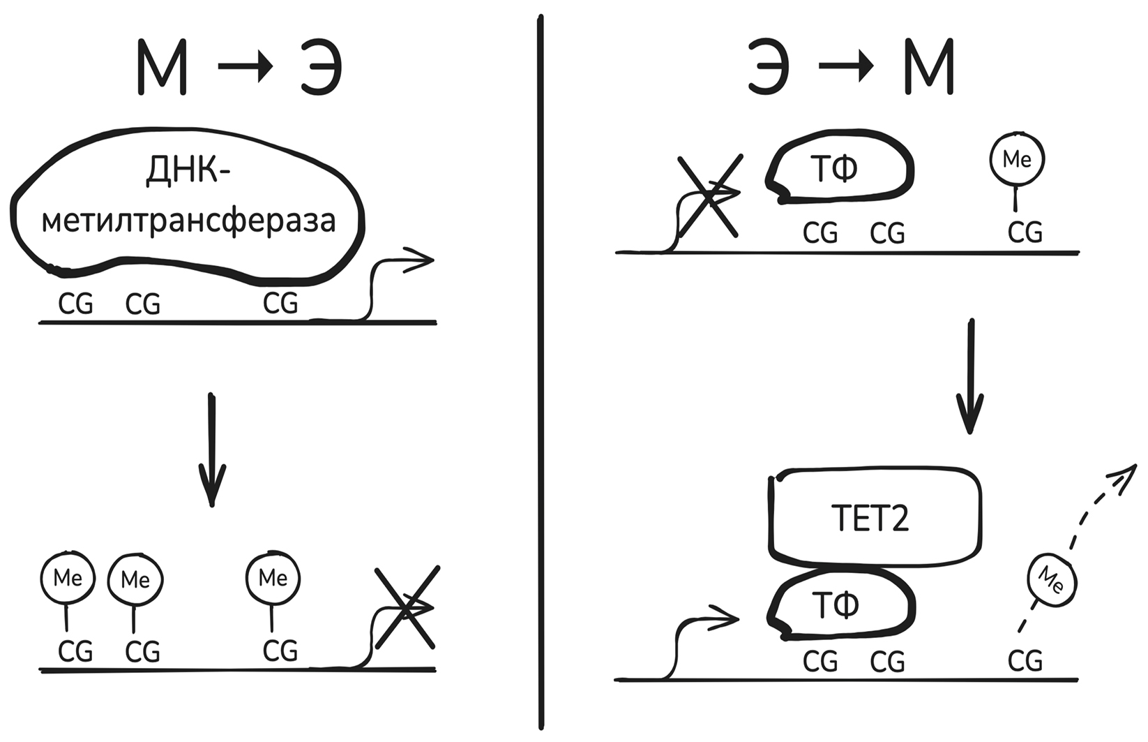 Рис. 3. Предполагаемый механизм функционирования CpG-светофоров. На левой панели представлены CpG-светофоры, в которых изменения уровня метилирования (Ме) вызывают изменения экспрессии ассоциированного гена. Такие CpG-светофоры чаще встречаются в промоторах, их метилирование стабильно и работают онипо принципу “вкл/выкл”. Правая панель показывает CpG-светофоры, для которых уровень метилирования зависит от экспрессии гена. Их метилирование различно между клетками и динамично, что вызвано активным деметилированием. Деметилирование происходит под действием метилцитозиндиоксигеназы TET2, которая привлекается транскрипционными факторами (ТФ).