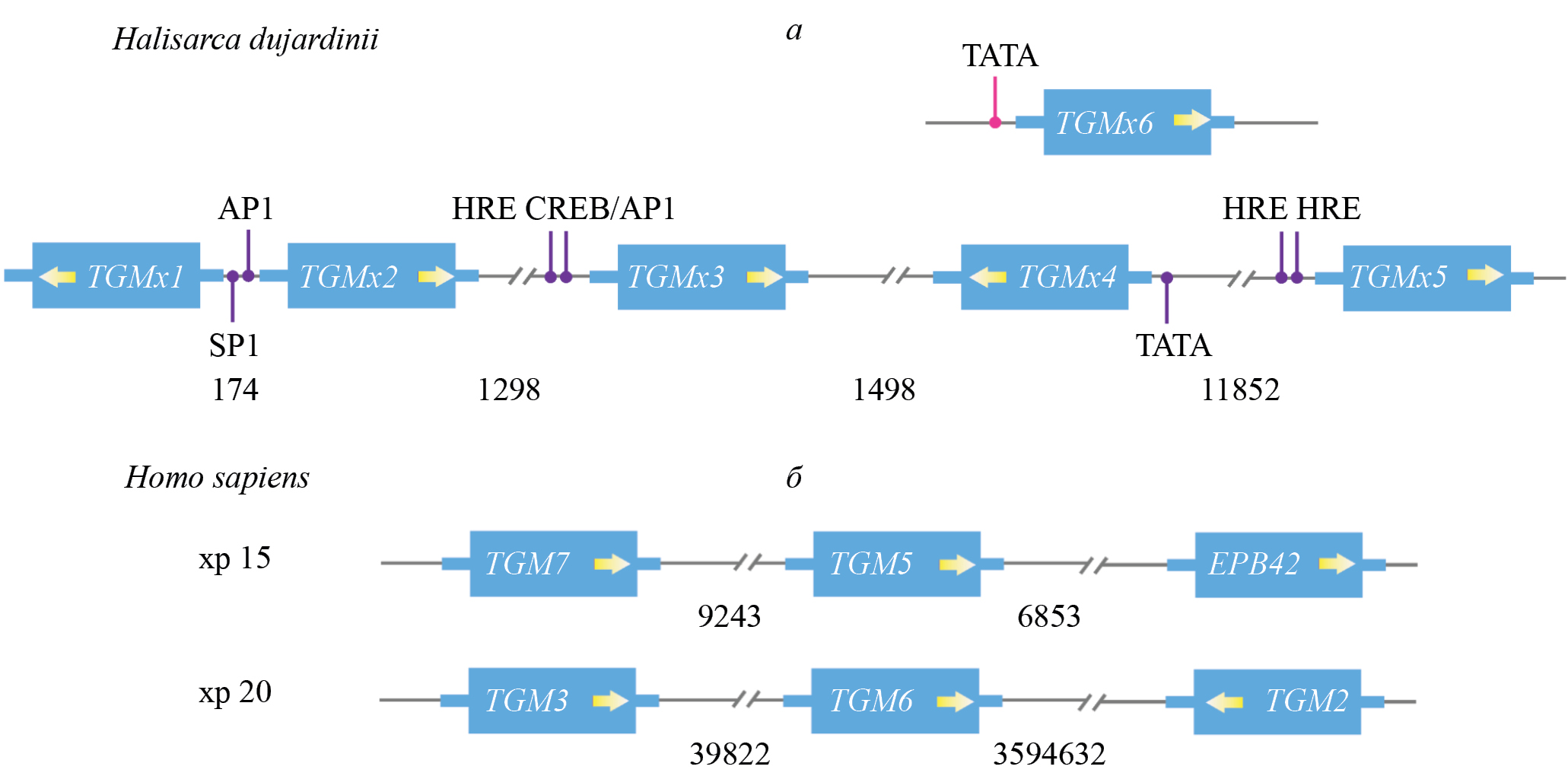 Рис. 2. Гены TGM губки H. dujardinii (а) и человека (б). Цифрами указаны расстояния между генами в парах нуклеотидов. В 5´-области генов губки H. dujardinii показаны регуляторные последовательности: ТАТА-бокс; HRE – элемент, отвечающий на гипоксию; AP1, SP1, CREB/AP1 – сайты связывания с соответствующими транскрипционными факторами.