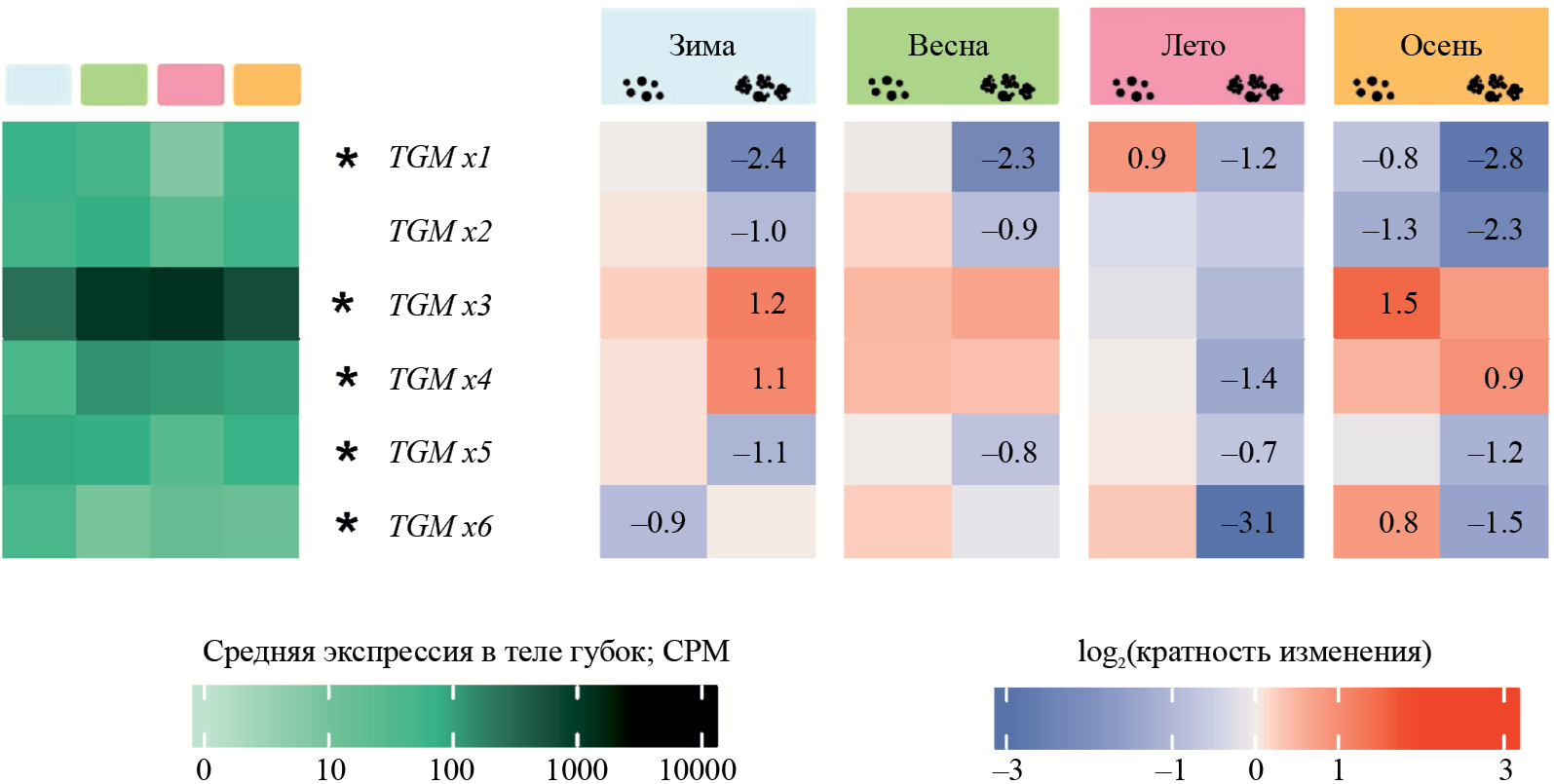 Рис. 3. Экспрессия генов TGM при диссоциации/реагрегации губки H. dujardinii в разные периоды годового цикла. Слева показан уровень экспрессии генов в ткани тела губки в разные периоды годового цикла. Голубым, салатовым, розовым и оранжевым цветом обозначены зима, весна, лето и осень соответственно. *Статистически значимые различия в экспрессии генов TGM в ткани тела губки в разные сезоны. Справа показано изменение экспрессии в диссоциированных клетках и клеточных агрегатах по сравнению с интактной губкой. Большими и маленькими точками обозначены диссоциированные клетки и агрегаты. Справа на тепловой карте приведены только статистически значимые различия (FDR < 0.001, см. Экспериментальную часть).