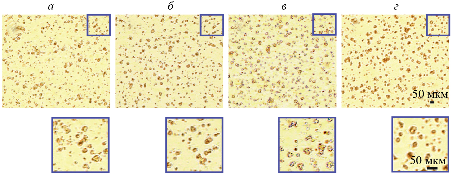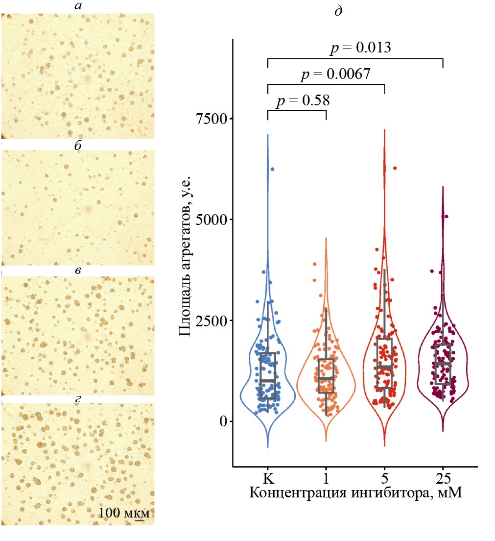 Статистический анализ. Результаты микроскопии анализировали при помощи встроенных функций языка R v.3.4 и визуализировали с использованием пакета R ggplot2 v.3.4.4 [53]. По полученным гистограммам вычисляли медианные значения уровней интенсивности флуоресценции каждого образца. Показатели площади агрегатов использовали в исходном виде. Каждую группу образцов попарно сравнивали с контрольной с помощью критерия Манна‒Уитни. Использовали стандартный уровень значимости p <0.05.