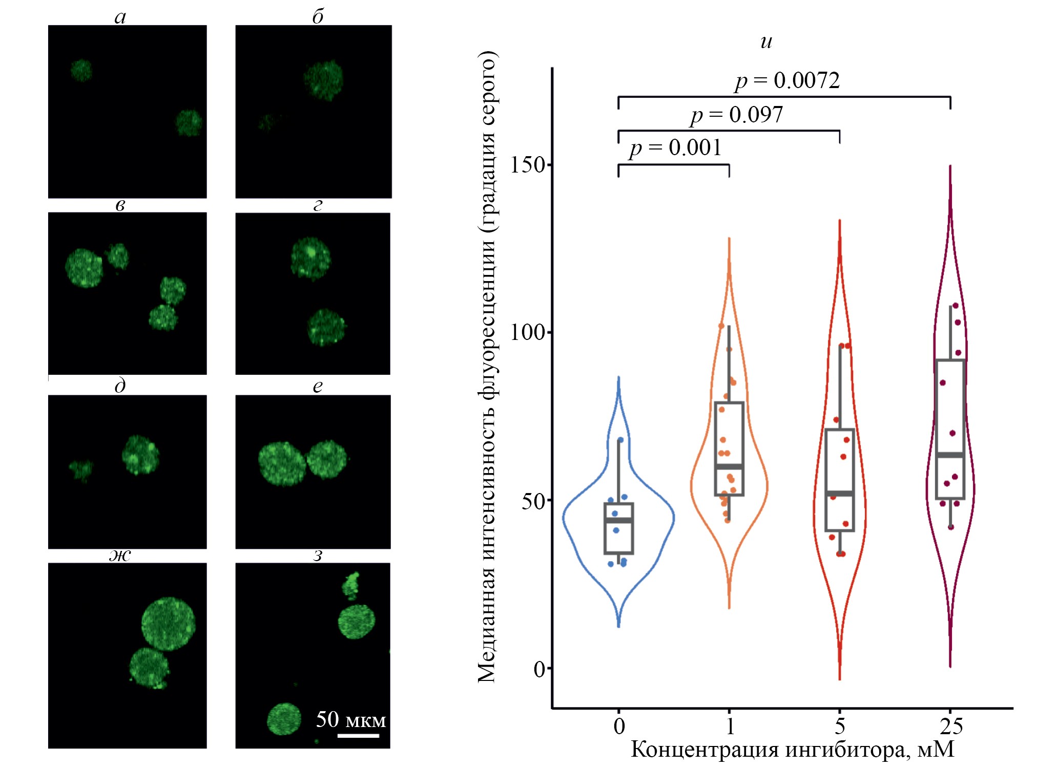 Рис. 9. Флуоресценция клеточных агрегатов после добавления в инкубационную среду H2DCFDA. а,б – Контроль. В присутствии цистамина: в,г – 1 мМ; д,е – 5 мМ; ж,з – 25 мМ. и – Сравнительный анализ интенсивности флуоресценции.