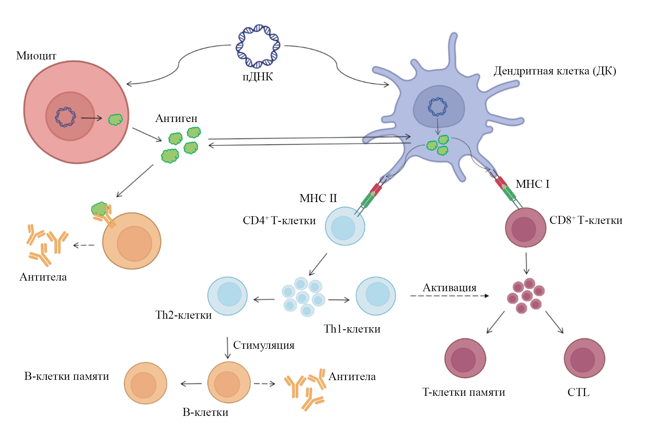 Рис. 2. Схема активации гуморального и клеточного иммунитета в ответ на введение ДНК-вакцины. Обозначения: пДНК — плазмидная ДНК (здесь и далее на рисунках); CTL (сytotoxic T cells) — цитотоксические Т-лимфоциты.