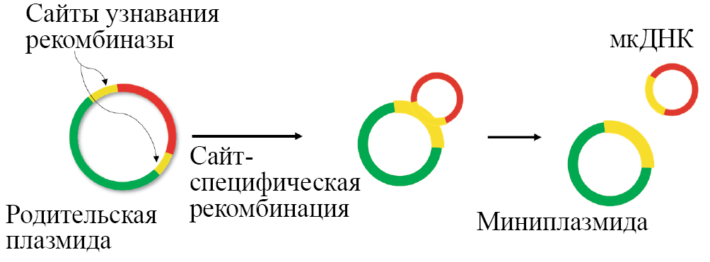 Миникольцевая ДНК-вакцина (мкДНК) представляет собой кольцевую молекулу ДНК, которая разработана с учетом несовершенств плазмидной ДНК. В мкДНК отсутствуют бактериальные последовательности, а именно ген устойчивости к антибиотику и бактериальный ориджин репликации; содержатся только эукариотический промотор и целевой ген. Синтез мкДНК начинается с плазмидной ДНК, называемой родительской плазмидой (РП), которая содержит специфические последовательности — сайты рекомбинации, такие как att, loxP, MRS или attP/attB. РП может быть трансформирована в мкДНК и миниплазмиду с помощью сайт-специфических рекомбиназ, таких как Phage λ integrase, Phage P1 Cre recombinase, ParA resolvase, PhiC31 integrase/I-SceI. Заметим, что миниплазмида, полученная в результате процесса рекомбинации, содержит последовательность, узнаваемую эндонуклеазой рестрикции, что впоследствии приводит к деградации миниплазмиды (рис. 3).
