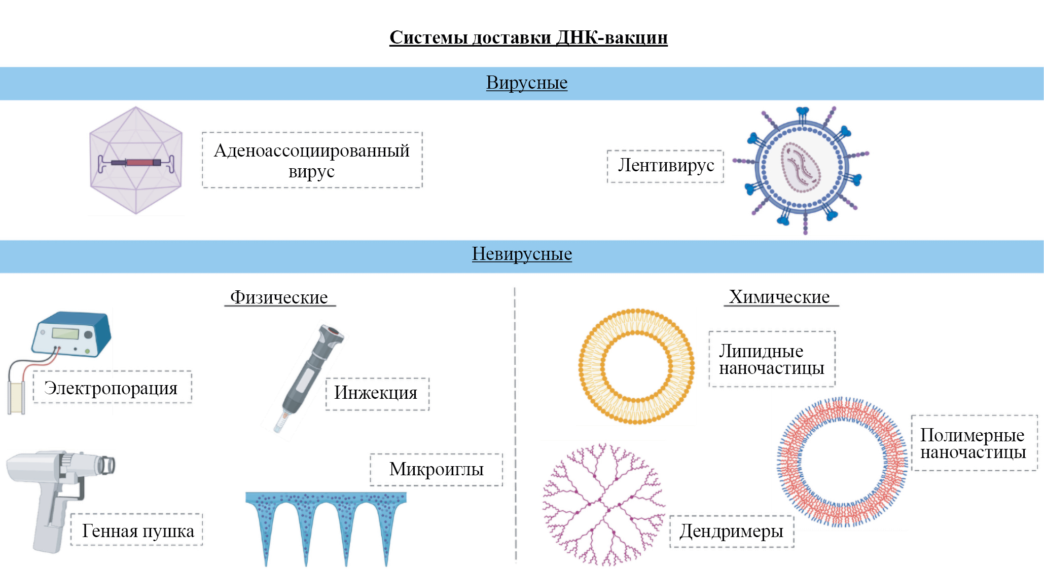 Один из факторов, играющих ключевую роль в эффективности ДНК-вакцин, — надежность и безопасность способа доставки, обеспечивающего высокий уровень проникновения нуклеиновых кислот в клетки-мишени. Как правило, системы доставки нуклеиновых кислот подразделяют на вирусные и невирусные (рис. 6). Невирусные способы доставки, в свою очередь, подразделяют на физические и химические.