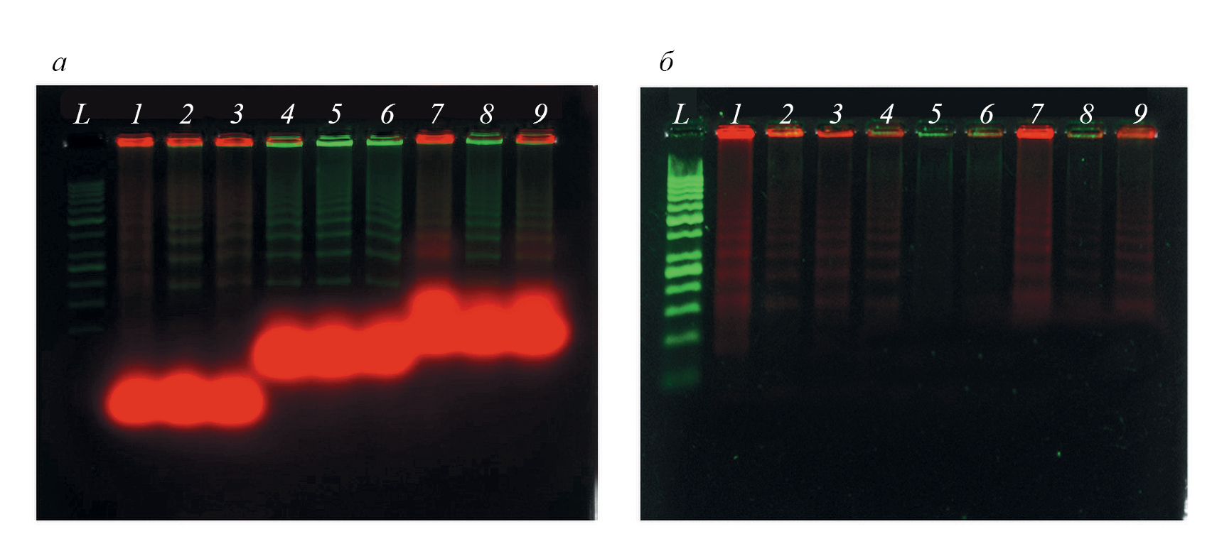 Рис. 3. Визуализация степени очистки продуктов реакции от свободных флуоресцентно-меченных нуклеозидтрифосфатов в двухканальном режиме возбуждения/детекции (“зеленый” канал 530/585 нм и “красный” канал 630/690 нм). а — Электрофореграмма продуктов RCA до очистки; б — после очистки. L — маркер длин дцДНК GeneRuler 50 bp; 1 — dUк; 2 — dCк; 3 — dUк+dCк; 4 — dU3; 5 — dC3; 6 — dU3+dC3; 7 — dU5; 8 — dC5; 9 — dU5+dC5.