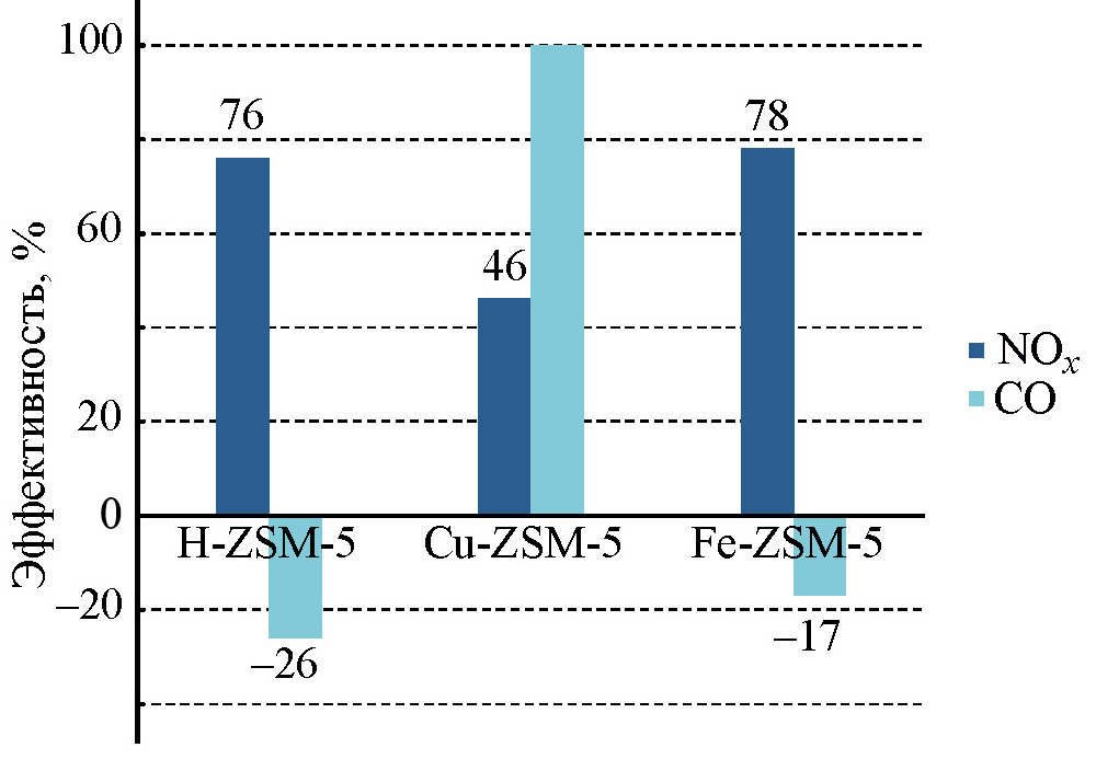 Все представленные добавки, за исключением систем (Mn, Cu, Fe) Ox–CeO2, работают совместно с добавками на основе платины, при этом достигается эффект сдерживания образования оксидов азота до 50% с потерей в эффективности по удалению СО до 70%.