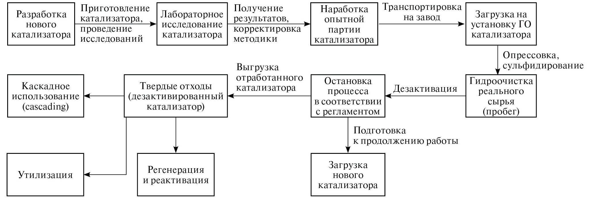 Последовательное использование (каскадирование) катализаторов. Термин «cascading» [13] получил широкое распространение за рубежом и подразумевает дополнительные возможности повторного или последовательного (каскадного) использования отработанных катализаторов в менее или более жестких условиях и процессах ГО. В литературе рассматривается несколько направлений каскадного применения дезактивированных, регенерированных и реактивированных катализаторов в зависимости от их состояния.