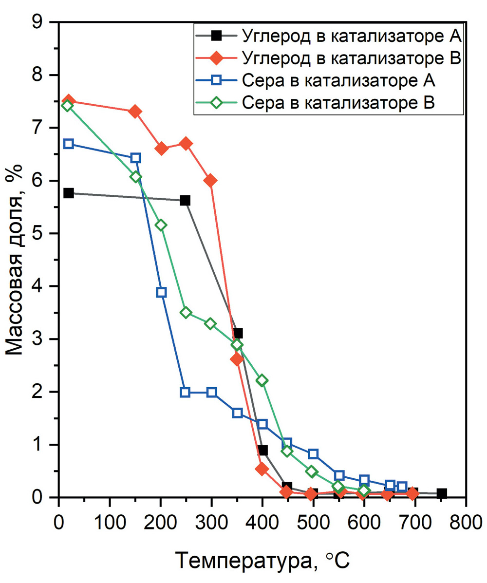 Наиболее активно используется направление по окислению коксовых отложений за счет использования кислородсодержащих смесей и воздуха для проведения регенерации. Многие авторы выполняли различные исследования в этом направлении. Одно из них представлено на рис. 2. По имеющимся зависимостям можно увидеть, что при увеличении температуры происходит снижение не только содержания углерода, наблюдаемое равномерно с увеличением температуры, но и серы, начинающееся с температуры около 200–250°С. Эти изменения свидетельствуют об удалении коксовых отложений и окислении сульфидной фазы и индивидуальных сульфидов Co, Ni и Mo. Наиболее активное удаление углерода заканчивается на температуре в 450°С, но полное удаление углеродных следов происходит при более высоких температурах, которые могут привести к необратимому фазовому изменению носителя.