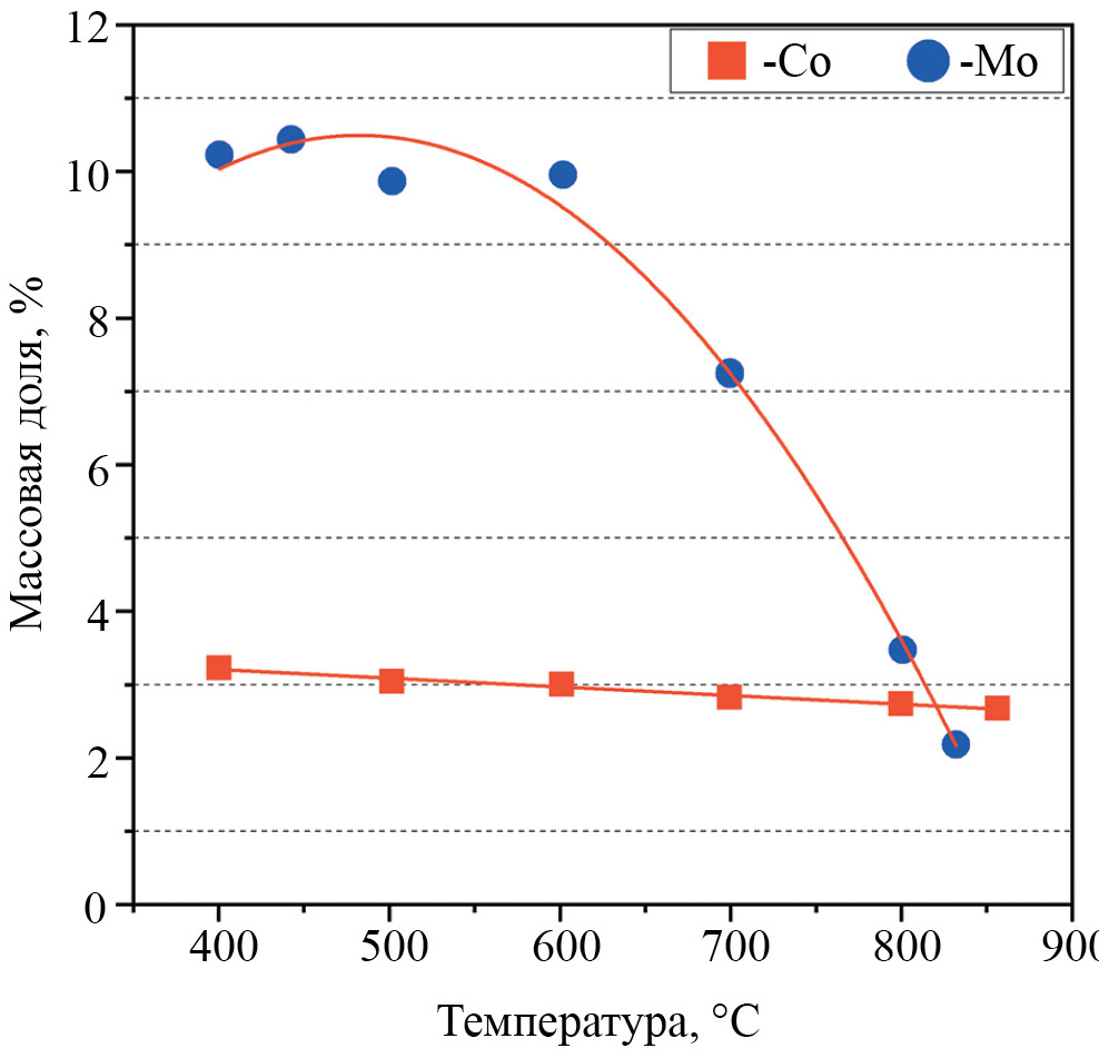 Отдельная проблема – возможность образования при регенерации in situ горячих зон с температурой около 700°С. При такой температуре происходит не только спекание катализатора, но и образование стабильных шпинелей Co и Ni, а также сублимация оксида Мо, который уносится потоком газа с поверхности катализатора и отлагается в относительно холодных участках реактора или на выходных трубопроводах. Как видно из данных рис. 3, при температуре регенерации выше 600°С происходит резкое снижение концентрации Мо на поверхности [39].