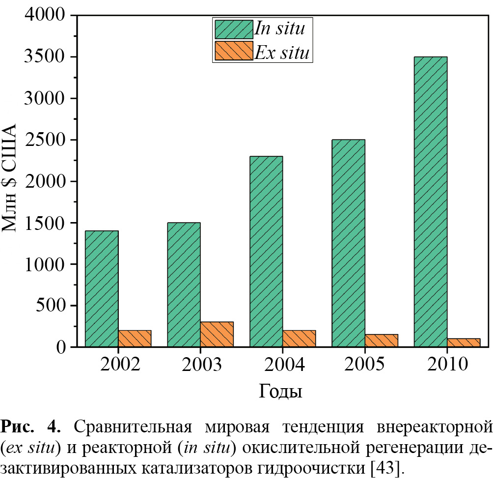 Рис. 4. Сравнительная мировая тенденция внереакторной (ex situ) и реакторной (in situ) окислительной регенерации дезактивированных катализаторов гидроочистки [43].