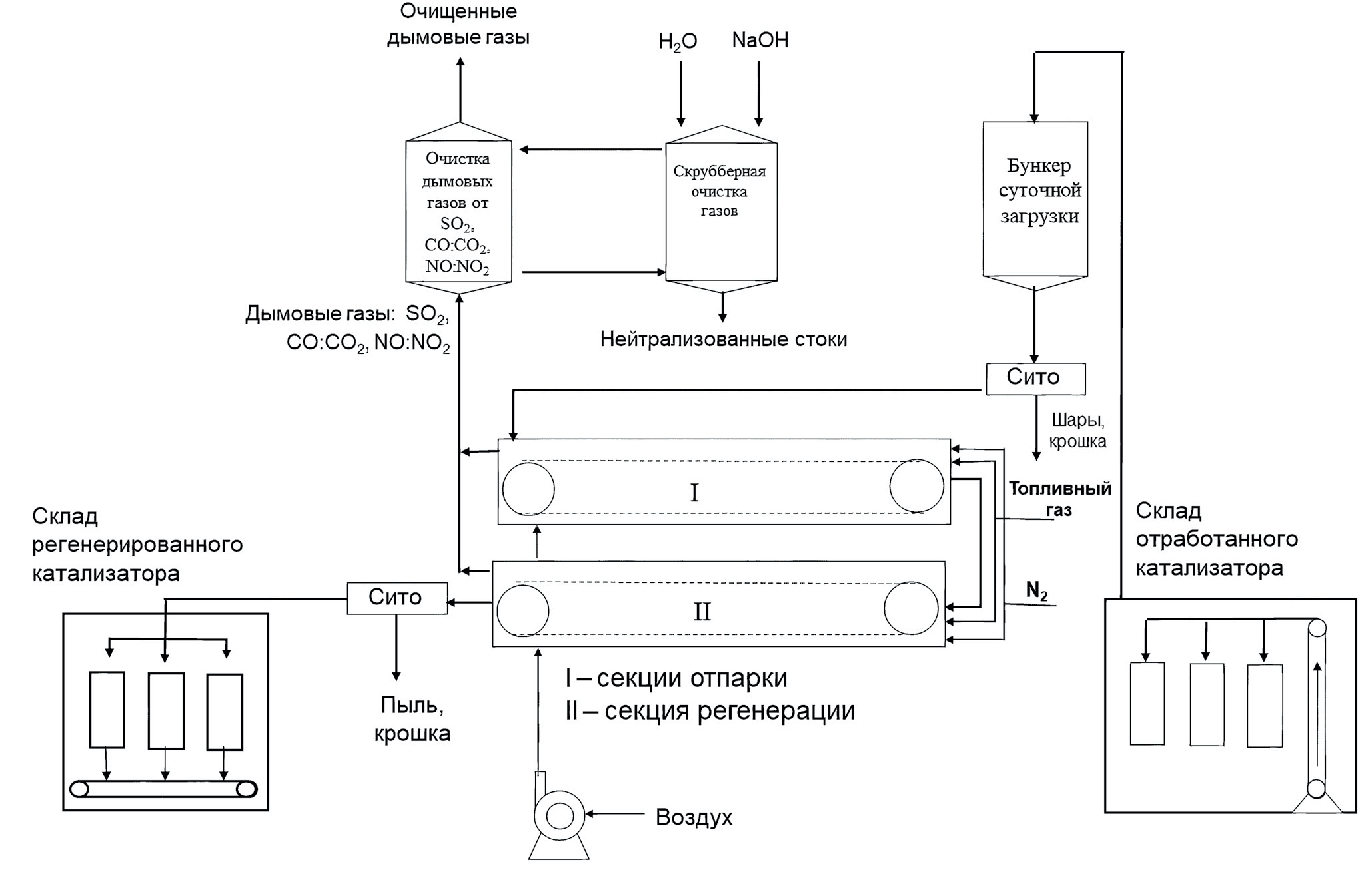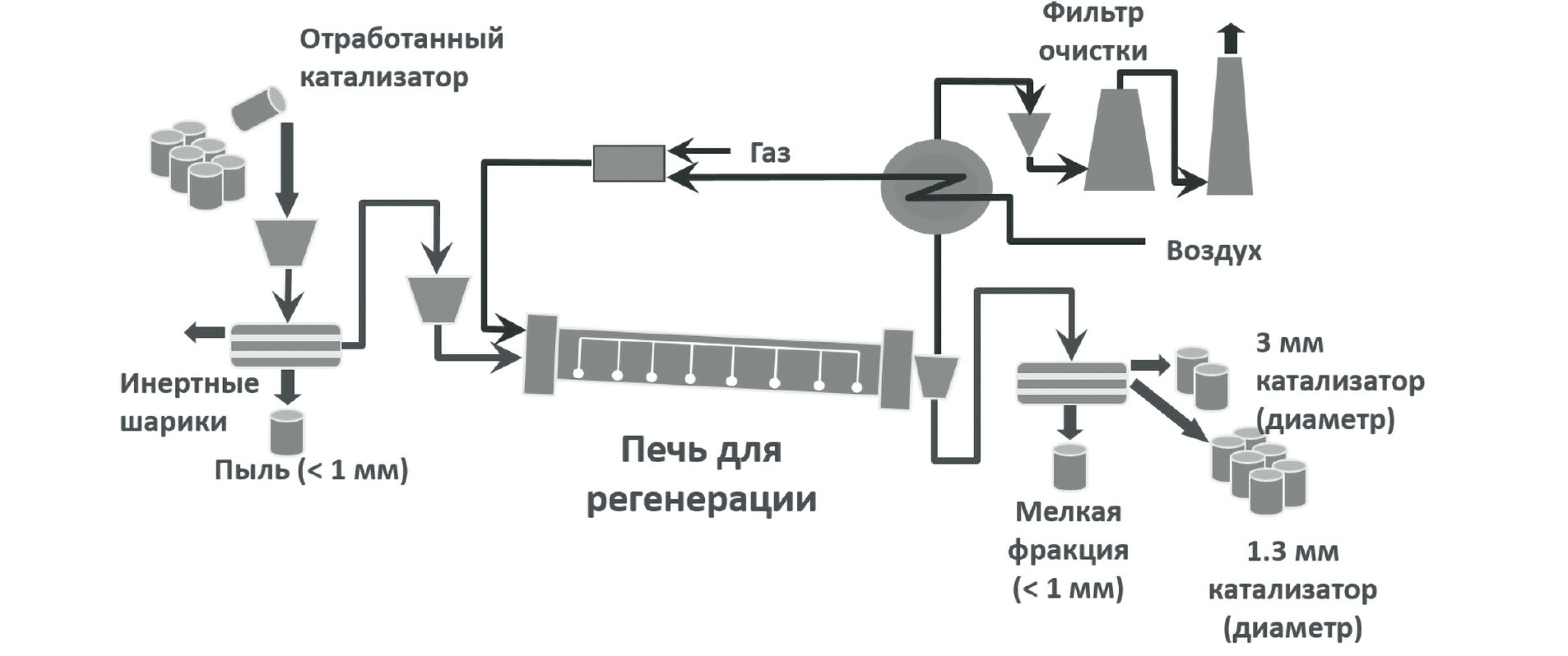 Eurecat Process. Технология непрерывной регенерации в барабанной вращающейся печи разработана фирмой Eurecat – European Reprocessing Catalysts [44, 45]. Улучшенная схема данной регенерации применяется на заводах Al Bilad Catalyst Company. Принципиальная схема представлена на рис. 5 [2].