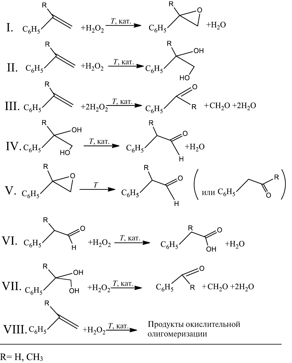 Примечание. В данной схеме маршруты I, III, VI–VIII ответственны за окисление стирола и его метилпроизводных с участием H2O2, маршрут II – за окислительное дигидроксилирование их с участием H2O2, IV – за дегидратацию диола, а маршрут V – за изомеризацию оксиранов в альдегиды.